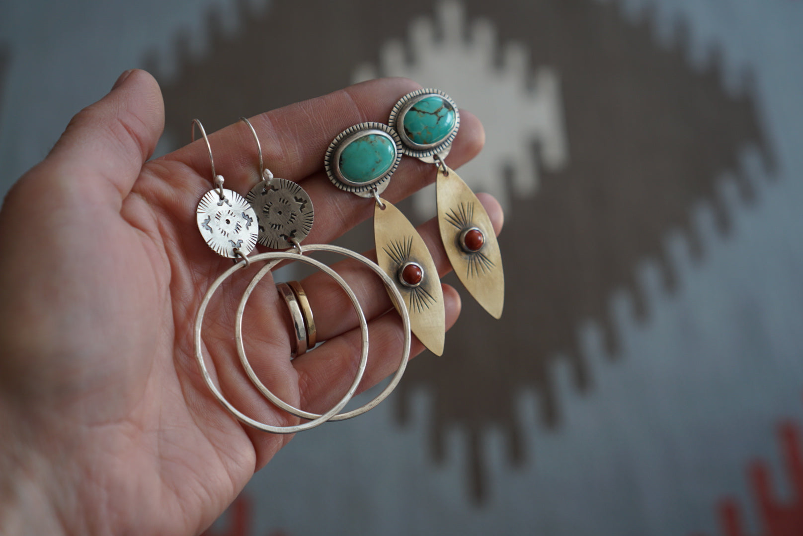 Have you ever wanted to have one set of earrings for everything? Look no further. This set includes a classic pair of American mined Turquoise post earrings that can be paired with either the brass sunburst dangles or the sterling silver hoops for a statement post earring, or the brass components and the silver components can be worn solo. Mix and match for your perfect pair. Earrings come with comfort clutch earnuts for wearing as post earrings and handmade sterling silver earwires for wearing as dangles.