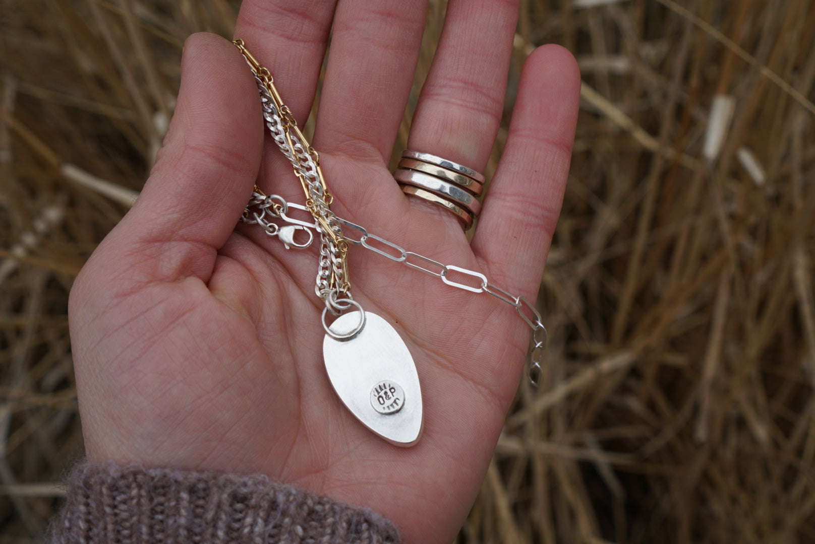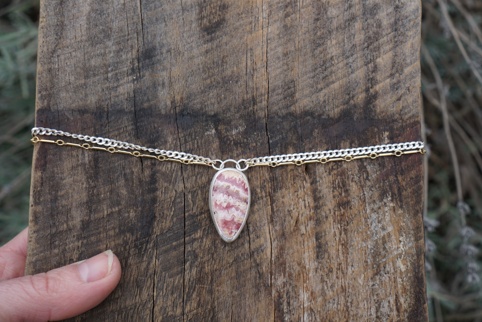 A gorgeous necklace hand crafted with beautiful pink Rhodochrosite, and two tone chains on either side consisting of 14K Goldfill bar and link chain and Sterling silver curb chain. Necklace measures 13 inches long and has an attached 3.5 inch sterling silver paperclip chain extender to allow for adjusting.