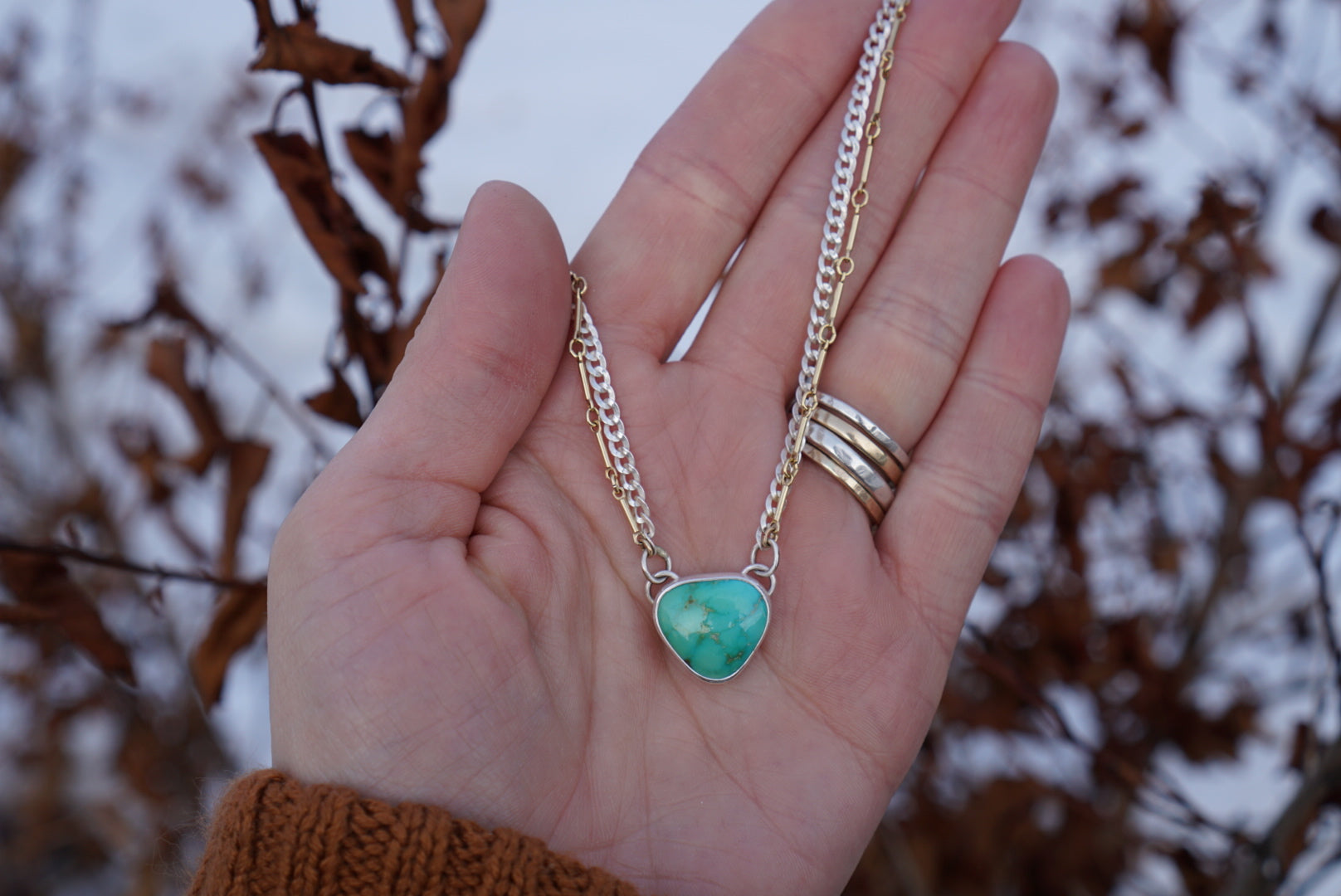 A gorgeous necklace hand crafted with high grade Emerald Valley Turquoise, and two tone chains on either side consisting of 14K Goldfill bar and link chain and Sterling silver curb chain. Necklace measures 14 inches long and has an attached 2.5 inch sterling silver paperclip chain extender to allow for adjusting.