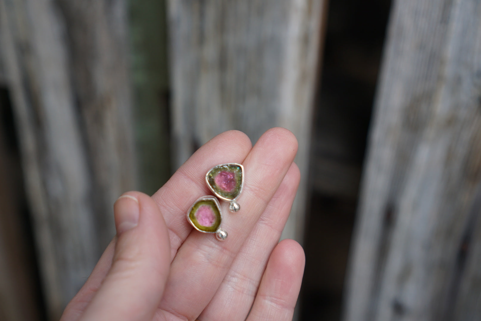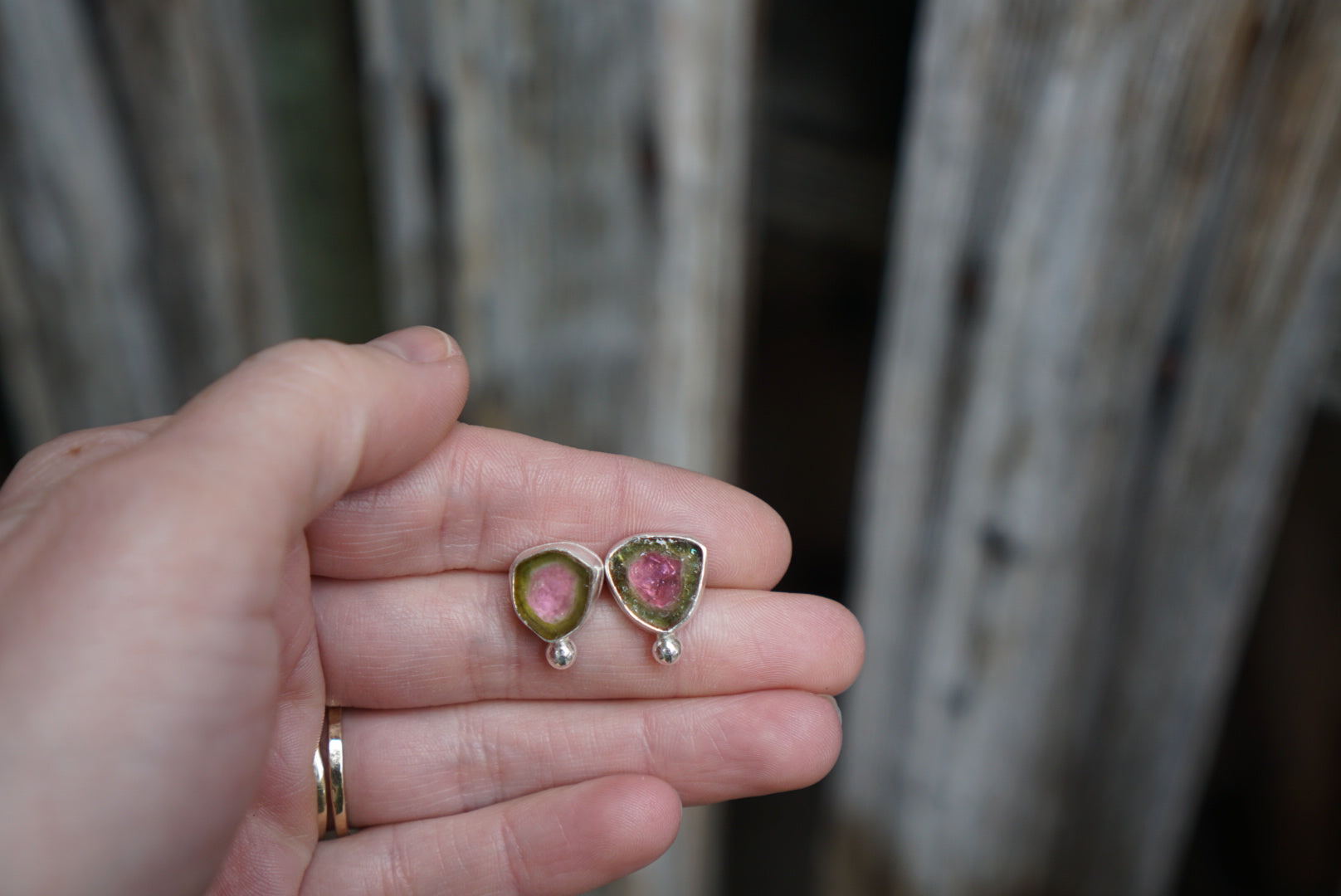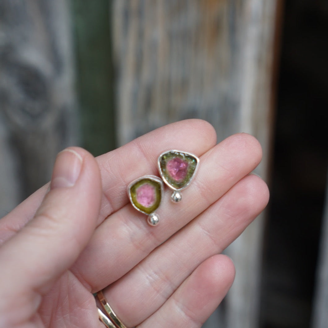 Adorable little posts featuring stunning slices of raw Watermelon Tourmaline. This pair is made with fine and sterling silver, with little silver ball accents and are finished with sterling silver posts and earnuts. Please note that these are raw stones, they are sisters not identical twins, and vary slightly in shape, color and texture, and have natural crackling and inclusions in the stones.