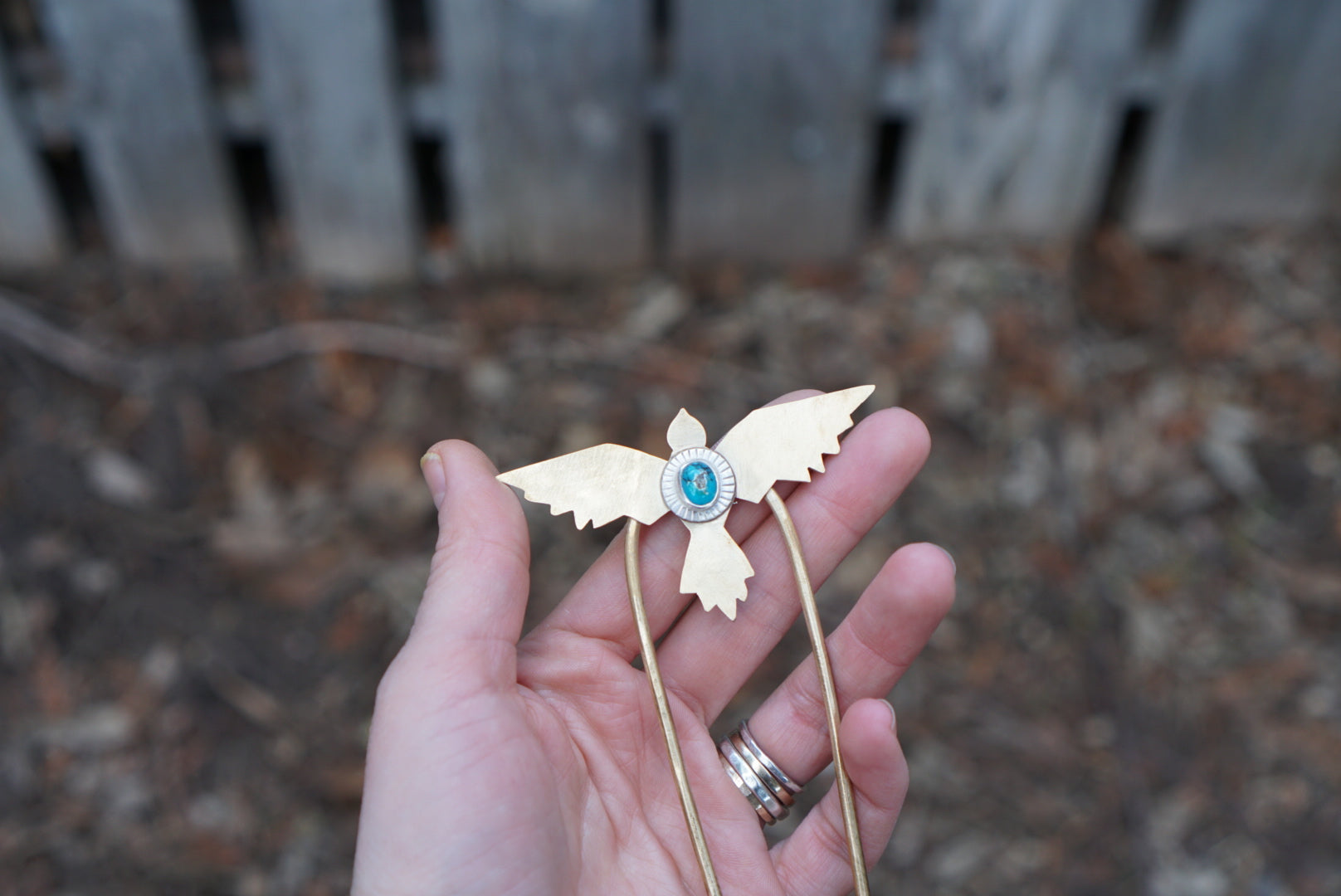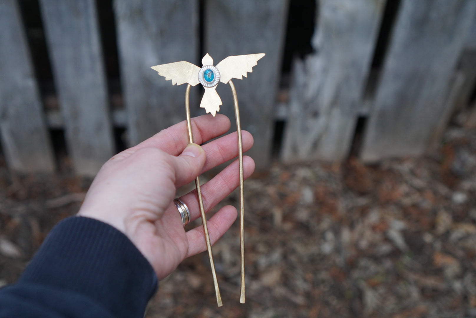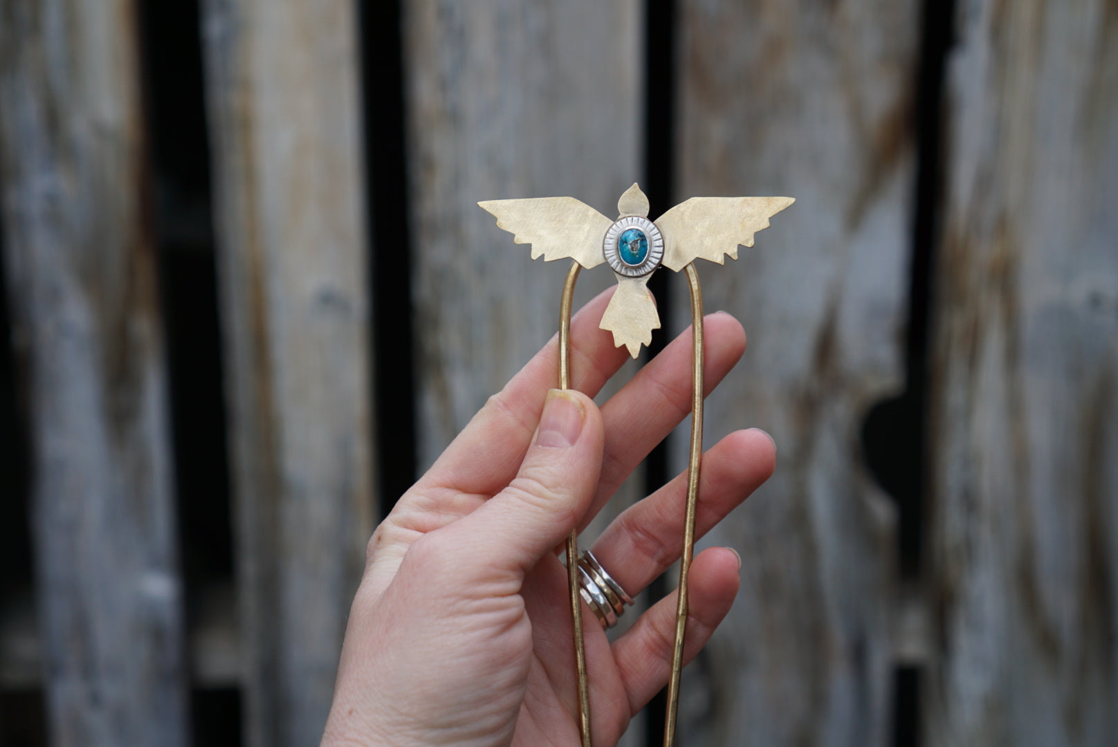 A sturdy hair fork made with thick brass prongs and featuring a hand drawn and sawed brass Phoenix bird with a little hunk of turquoise in the center. Hairfork is about 6 inches tall.