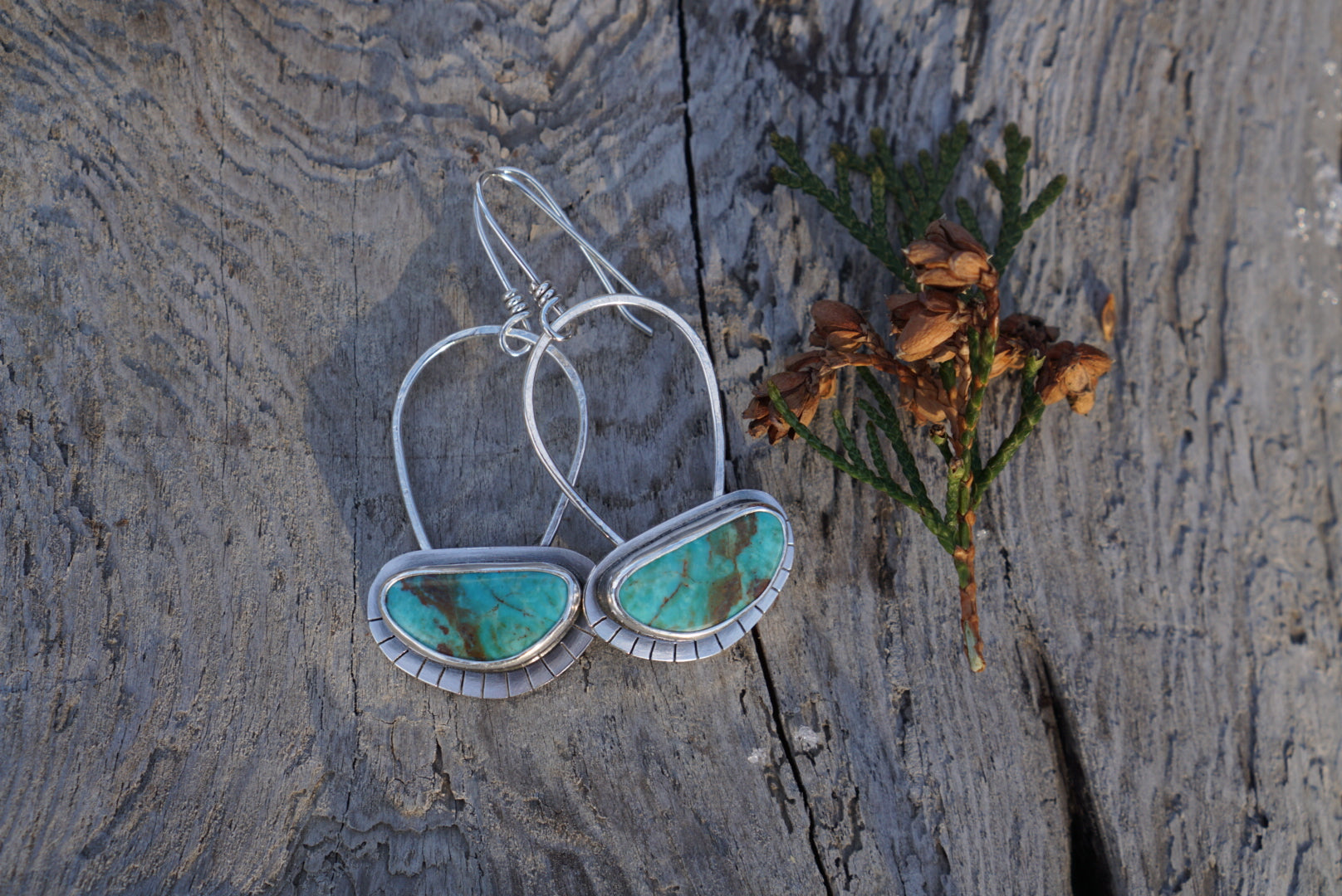 Classics!! Beautiful hunks of Kingman Turquoise are simply set in fine silver and nestled at the base of large handmade loops. Earrings feature hand stamped detail along the loops and hand sawed sunburst detail along the base of the stones. Earrings are oxidized and polished for a soft rustic glow and dangle from handmade sterling silver earwires. Earrings measure almost 2.5 inches in length from the top of the earwires to the base of the earring.