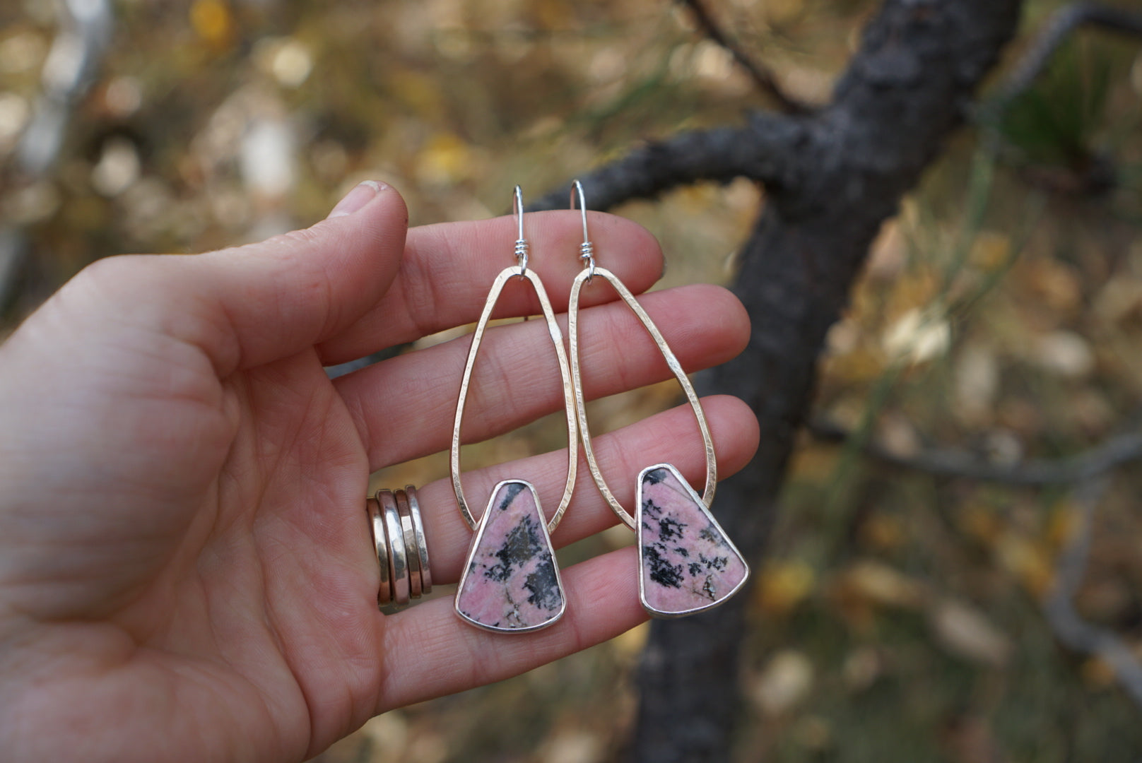 Classics!! Beautiful hunks of pink Rhodanite are simply set in fine silver and nestled at the base of large brass handmade loops. Earrings dangle from handmade sterling silver earwires. Earrings measure about 3 inches in length from the top of the earwires to the base of the earring.