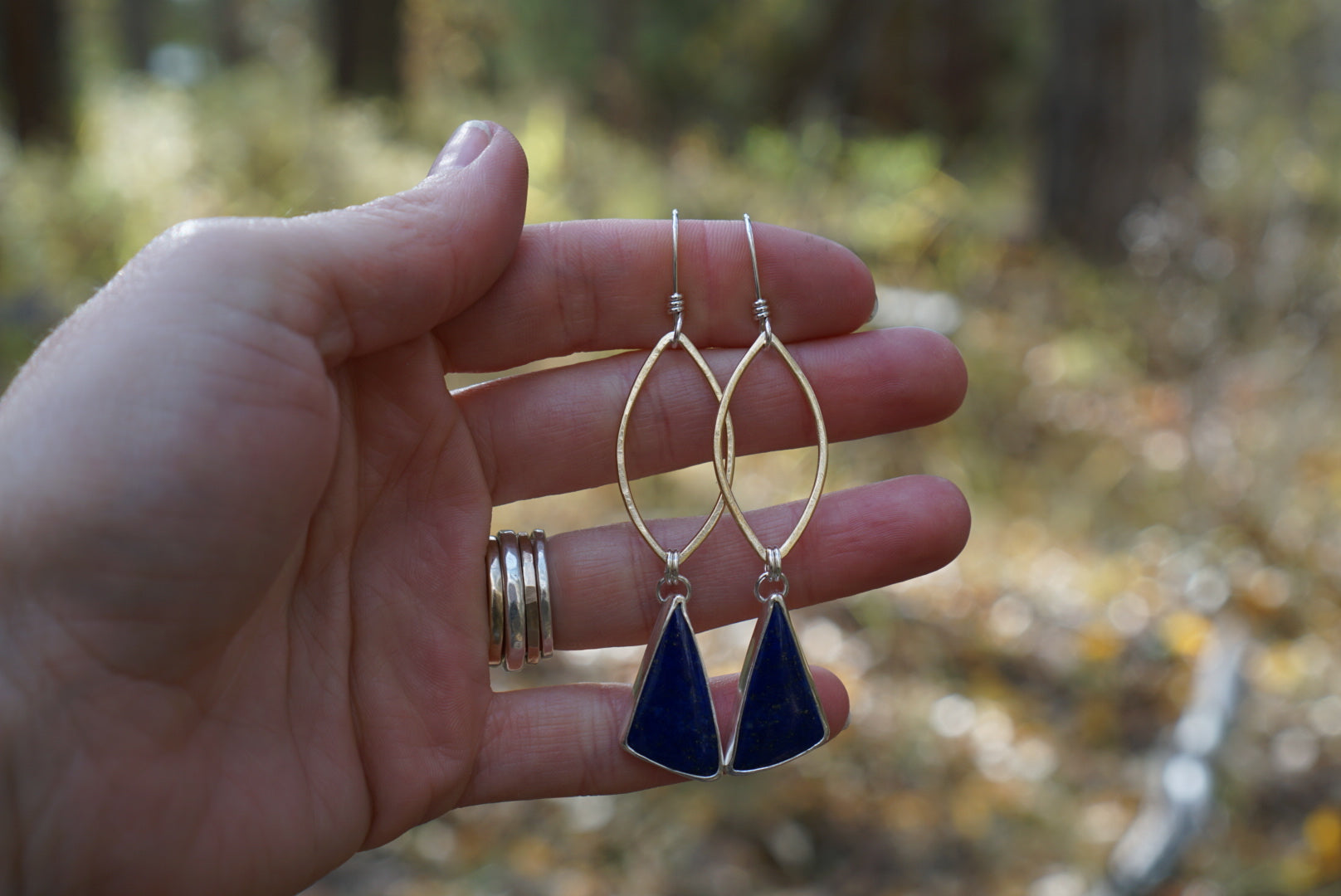 Classics!! My favorite almond shaped hoops are hand crafted in warm golden brass with lovely blue Lapis Lazuli stones wrapped in sterling silver dangling below. Finished with handmade sterling silver earwires and measuring almost 3 inches in length. Simple, beautiful and perfect for every occasion.
