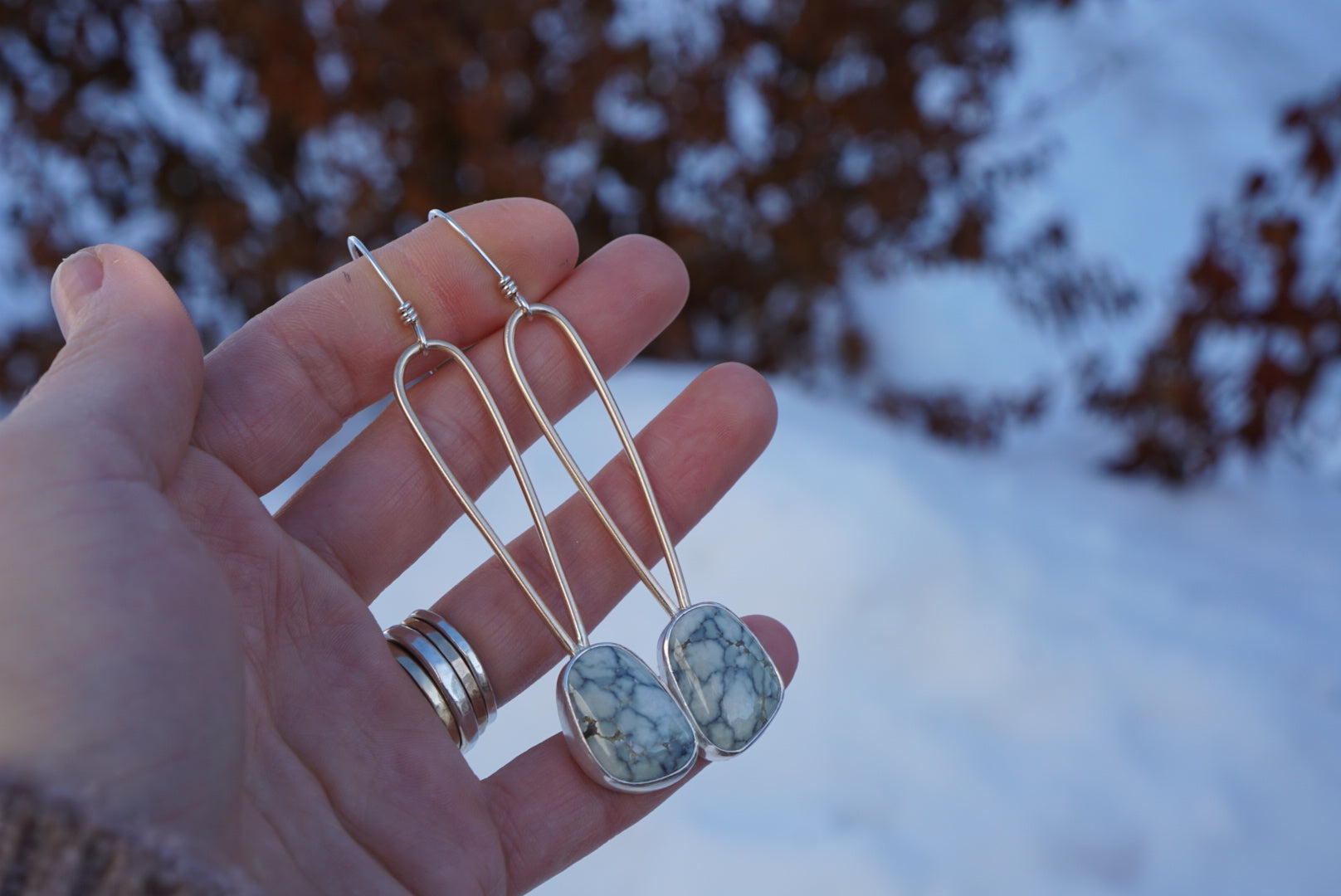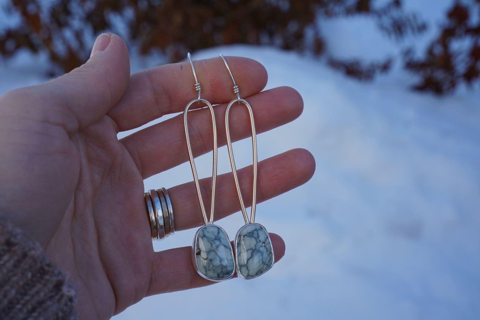Classics!! Beautiful hunks of creamy white and grey Ivory Creek Variscite gems are simply set in fine silver and nestled at the base of large 14k Gold fill handmade loops. Earrings dangle from handmade sterling silver earwires. Earrings measure about 3.25 inches in length from the top of the earwires to the base of the earring.