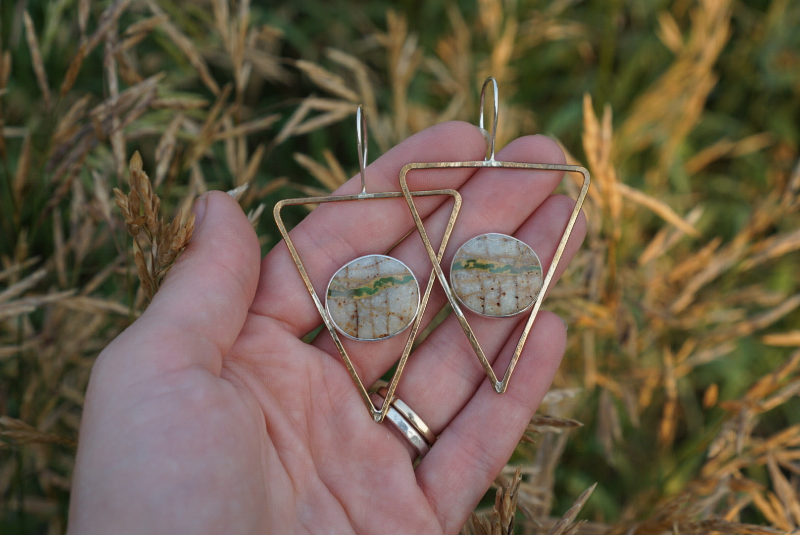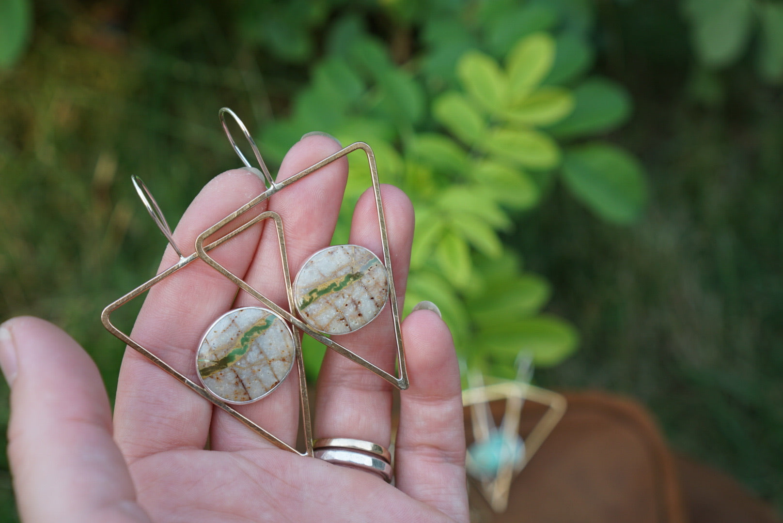 An O+P classic! Hand forged brass triangles, completely formed, soldered and hammered by hand with beautiful Royston Ribbon Turquoise set is recycled sterling silver and nested inside the triangle. Finished with handcrafted sterling silver threader earwires. These measure just over 2.5 inches long.