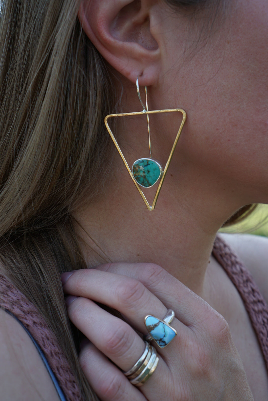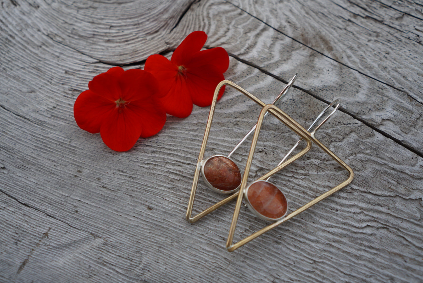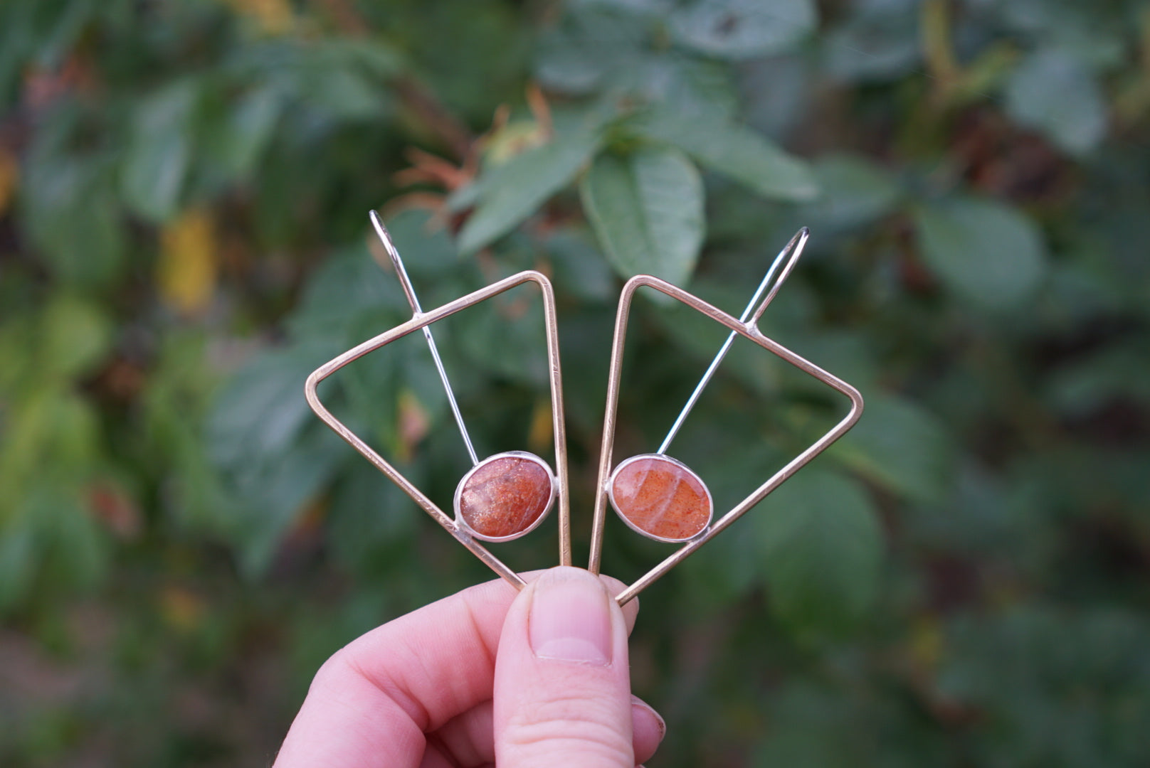 An O+P classic! Hand forged brass triangles, completely formed, soldered and hammered by hand with beautiful sparkly orange Sunstone gemstones set in recycled sterling silver and nested inside the triangle. Finished with handcrafted sterling silver threader earwires. These measure just over 2.5 inches long.