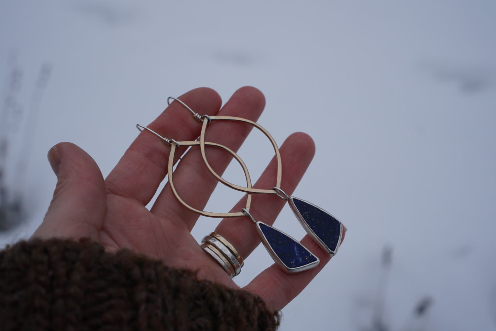 Classics!! My favorite almond shaped hoops are hand crafted in warm golden 14K Goldfill wire with lovely deep navy blue Lapis Lazuli stones wrapped in sterling silver dangling below. Finished with handmade sterling silver earwires and measuring almost 3.5 inches in length. Simple, beautiful and perfect for every occasion.