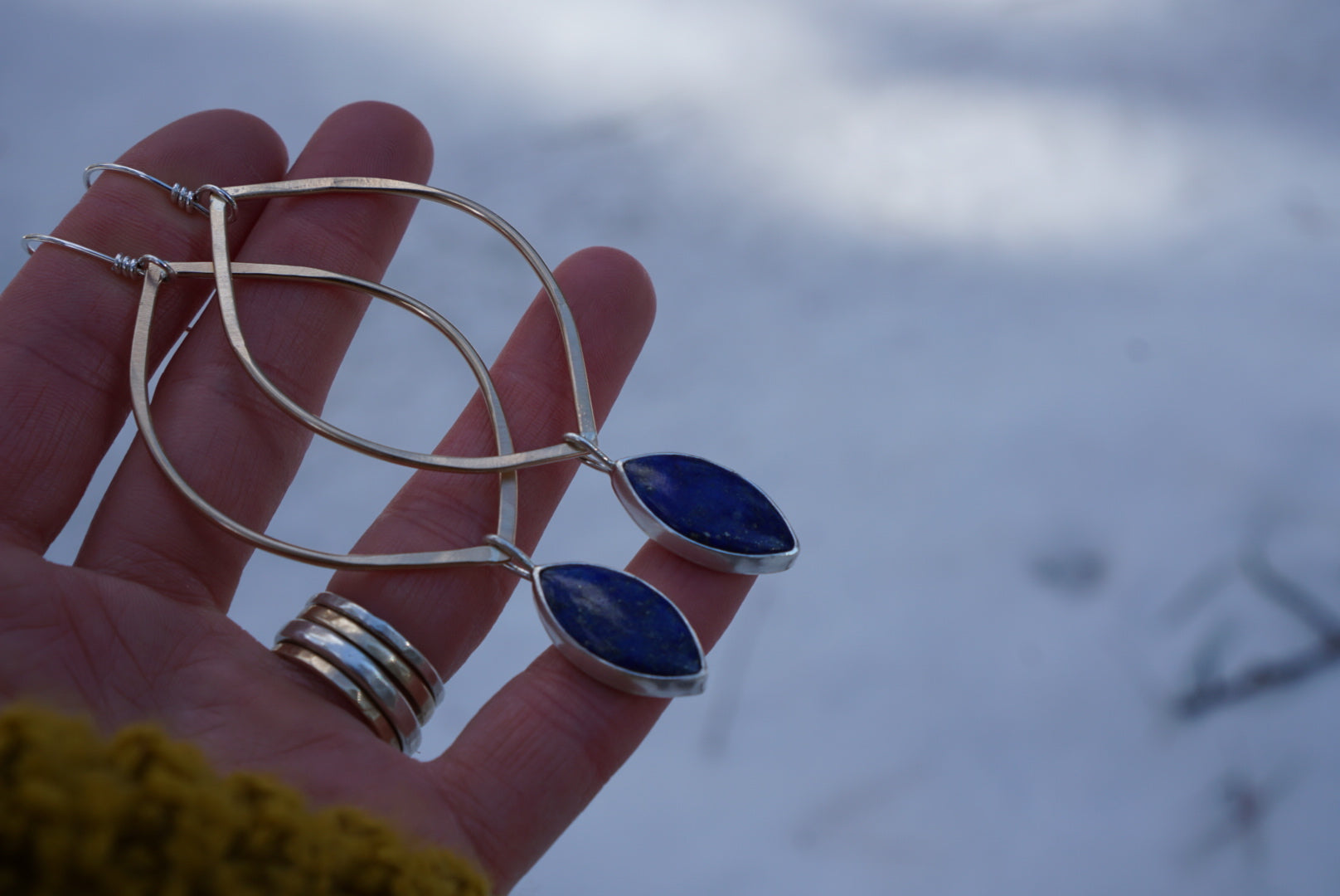 Classics!! My favorite almond shaped hoops are hand crafted in warm golden 14K Goldfill wire with lovely blue Lapis Lazuli stones wrapped in sterling silver dangling below. Finished with handmade sterling silver earwires and measuring almost 3.75 inches in length. Simple, beautiful and perfect for every occasion.