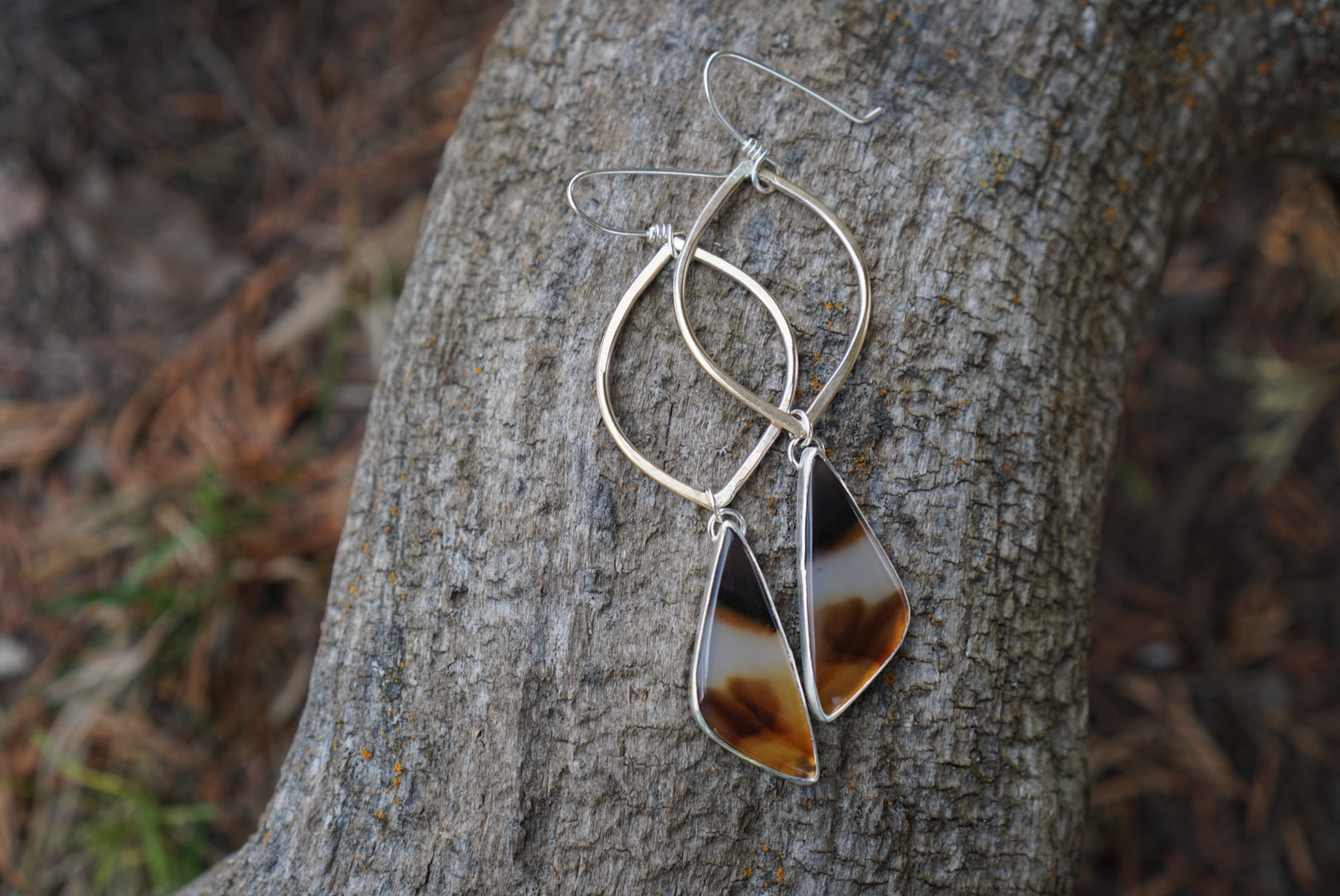 Classics!! My favorite almond shaped hoops are hand crafted in warm golden 14K Goldfill wire with lovely deep honey and brown hued Montana Agate stones wrapped in sterling silver dangling below. Finished with handmade sterling silver earwires and measuring almost 3.5 inches in length. Simple, beautiful and perfect for every occasion.