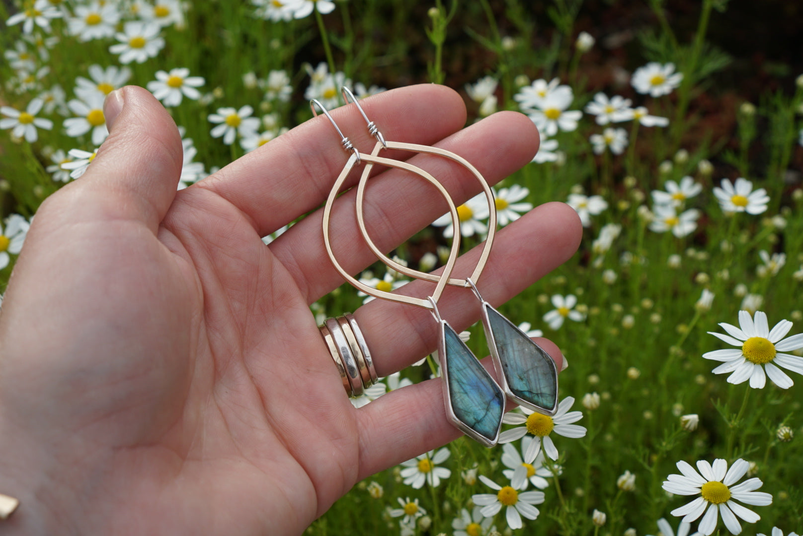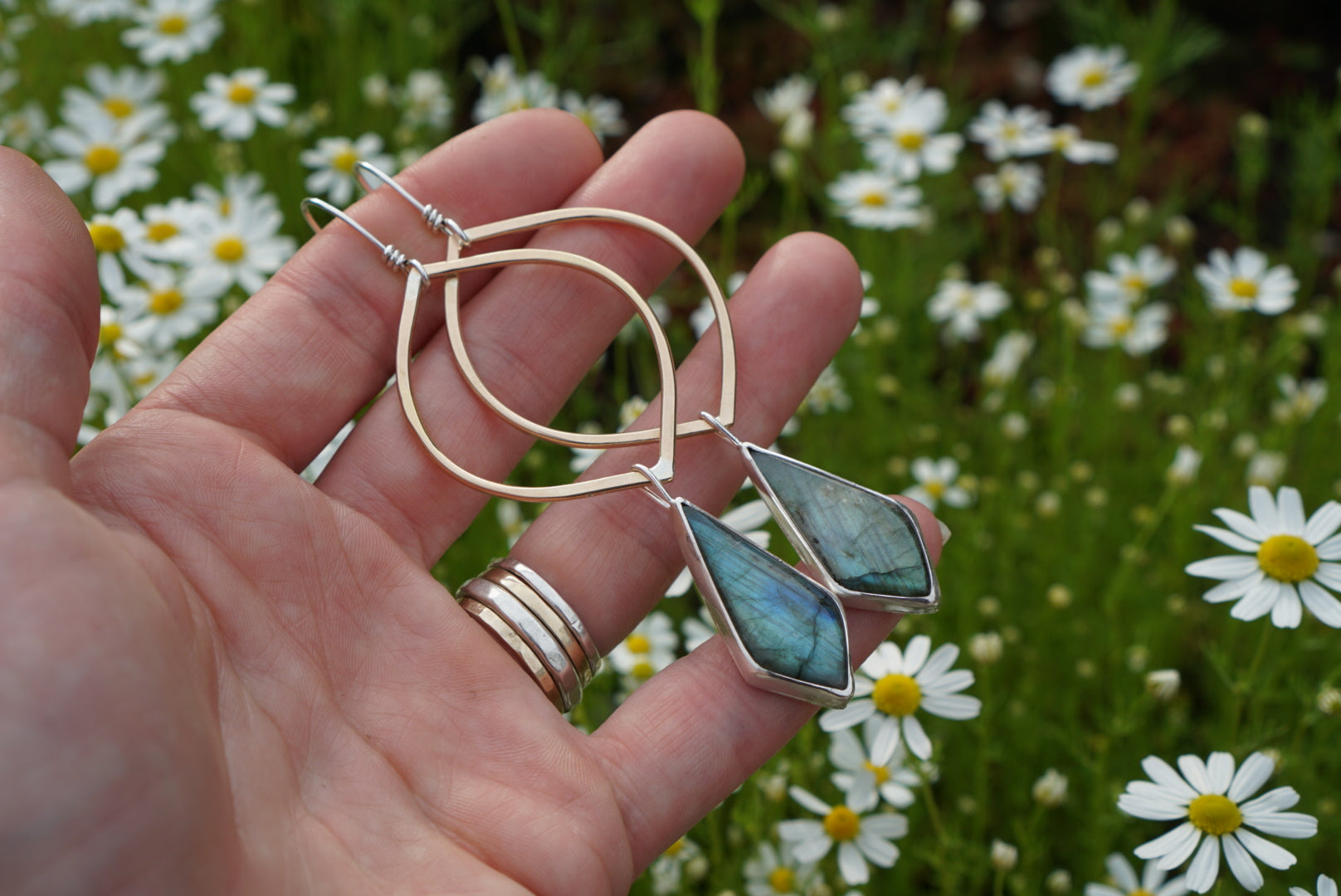 Classics!! My favorite almond shaped hoops are hand crafted in warm golden 14K Goldfill wire with lovely, flashy Labradorite stones wrapped in sterling silver dangling below. Finished with handmade sterling silver earwires and measuring almost 3.5 inches in length. Simple, beautiful and perfect for every occasion.
