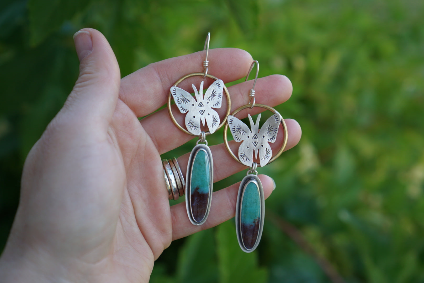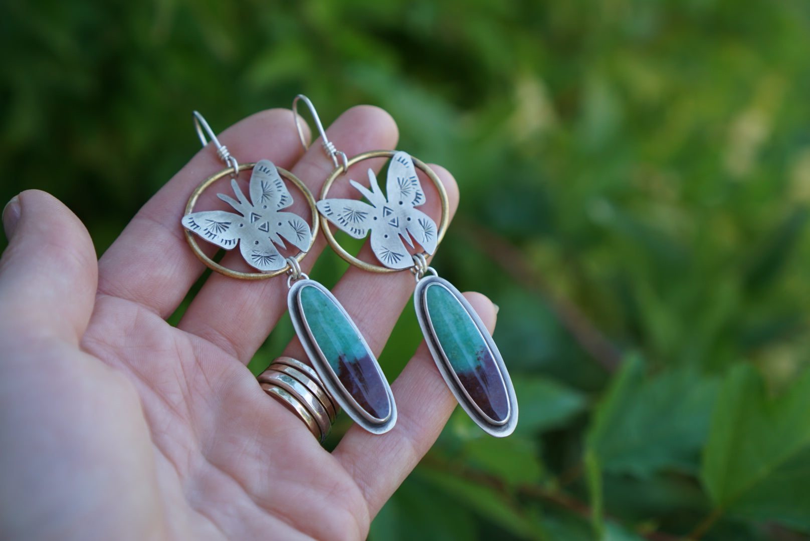 Absolutely stunning pair of earrings featuring the prettiest slices of petrified opalized wood gemstones simply set in sterling silver and dangling below brass hoops with hand sawed and stamped silver butterflies perched atop. These earrings dangle about 3.25 inches in length and are finished with handmade sterling silver earwires.