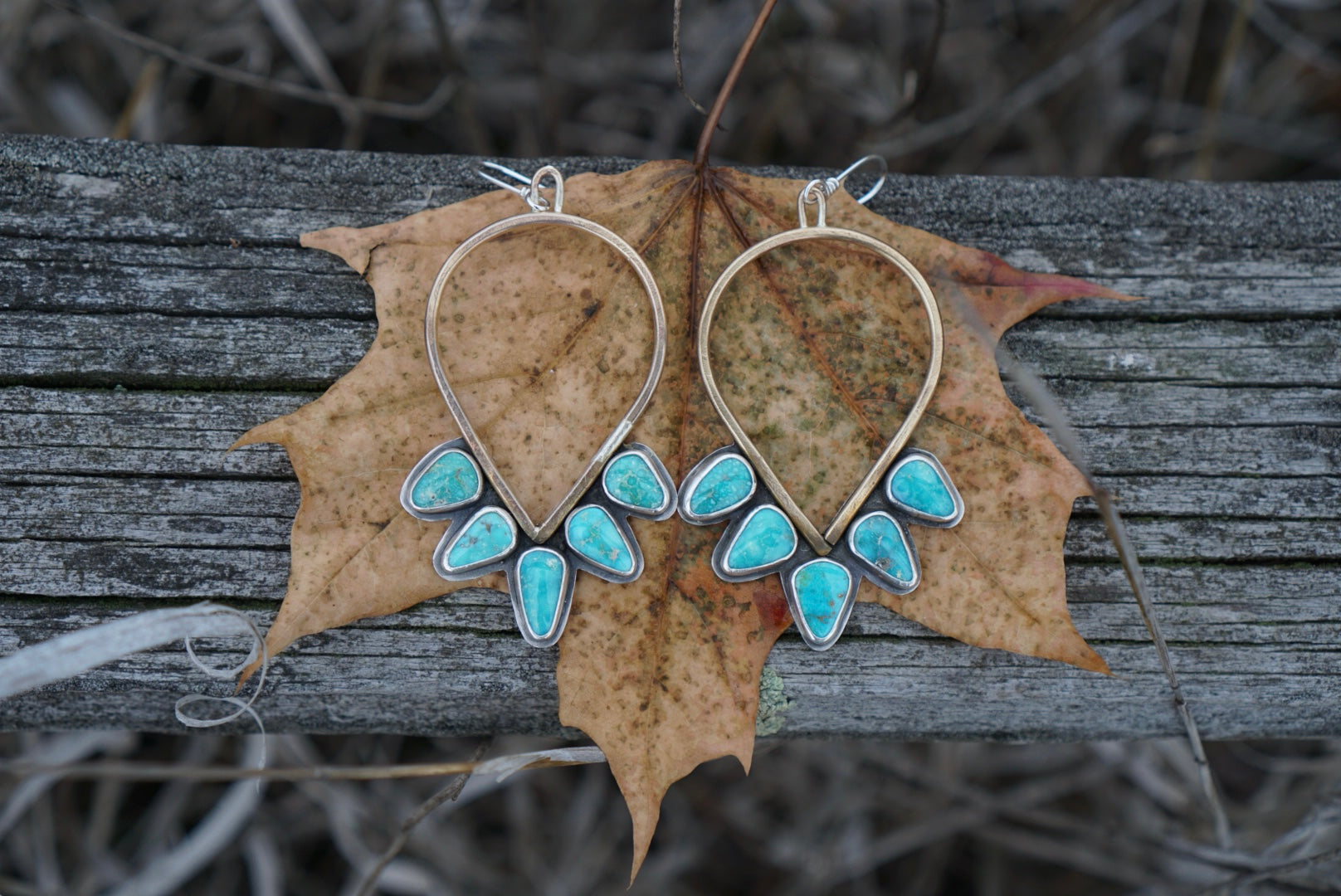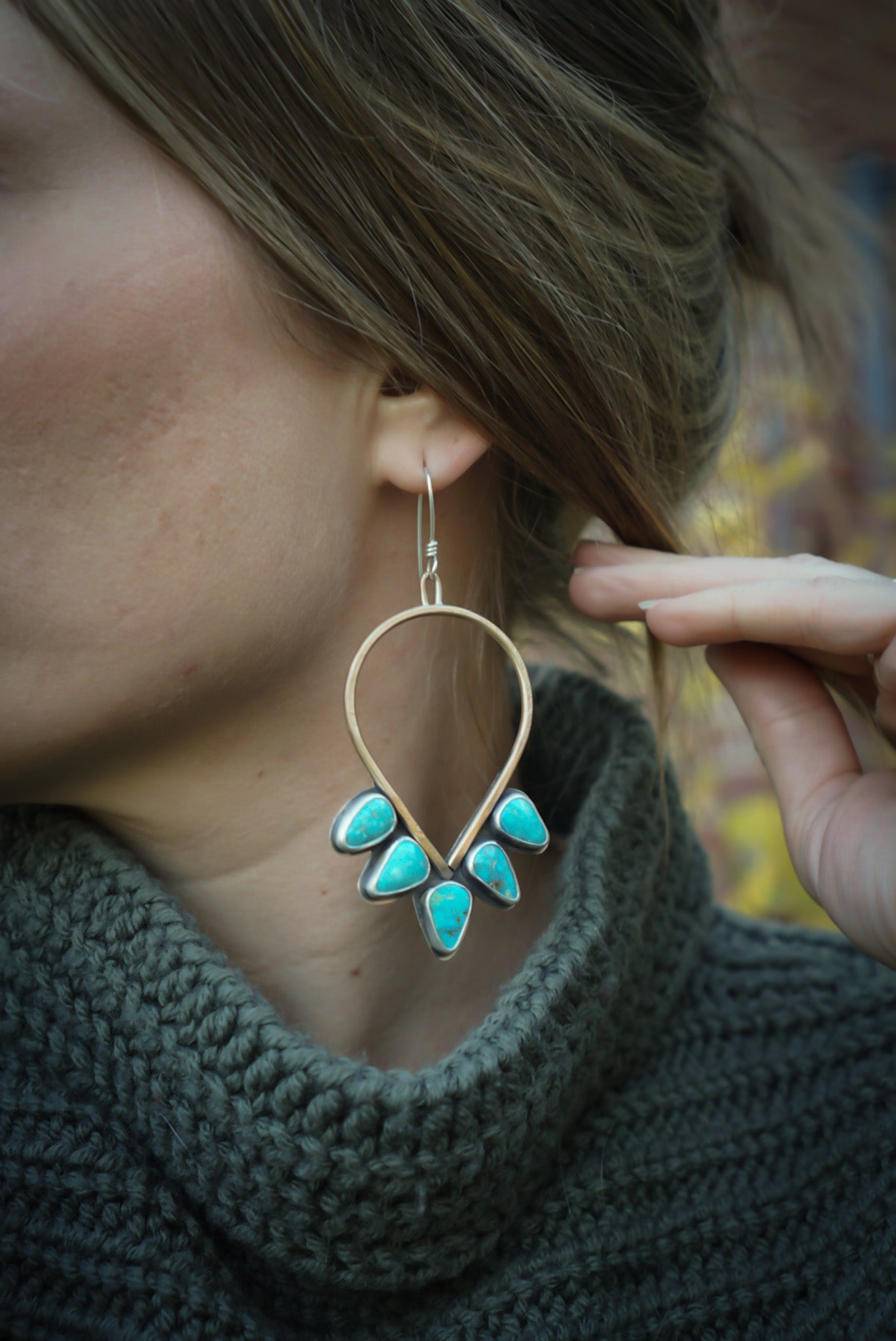 Absolutely stunning pair of earrings featuring multiple Sonoran Rose Turquoise teardrop gemstones set simply in fine and sterling silver and wrapped along the edge of an upside-down teardrop shaped hoop. This is such a lovely and unique design. Completed by hanging from handcrafted sterling silver earwires; these earrings dangle about inches long.