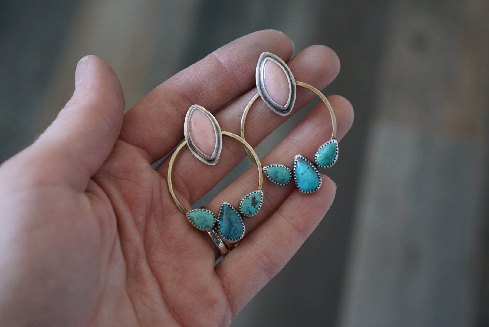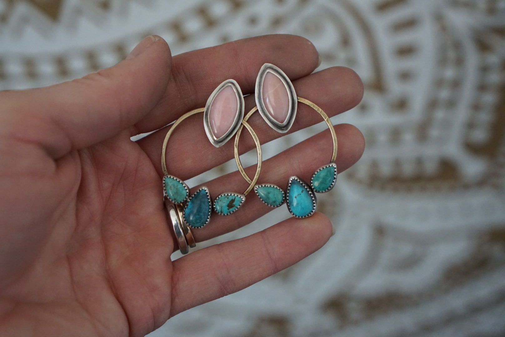 Absolutely stunning pair of earrings featuring a gorgeous combination of Turquoise and Peruvian Pink Opal. Each post hoop earring features a cluster of hand set in sterling silver; turquoise teardrop shaped stones clustered at the base and a beautiful almond shaped pink Opal perched at the top of brass hoops. Completed with sterling silver posts and comfort clutch earnuts. These are a great size and weight for everyday wear. These earrings measure about 1.75 inches long. Please note these are natural stones that have unique veining.