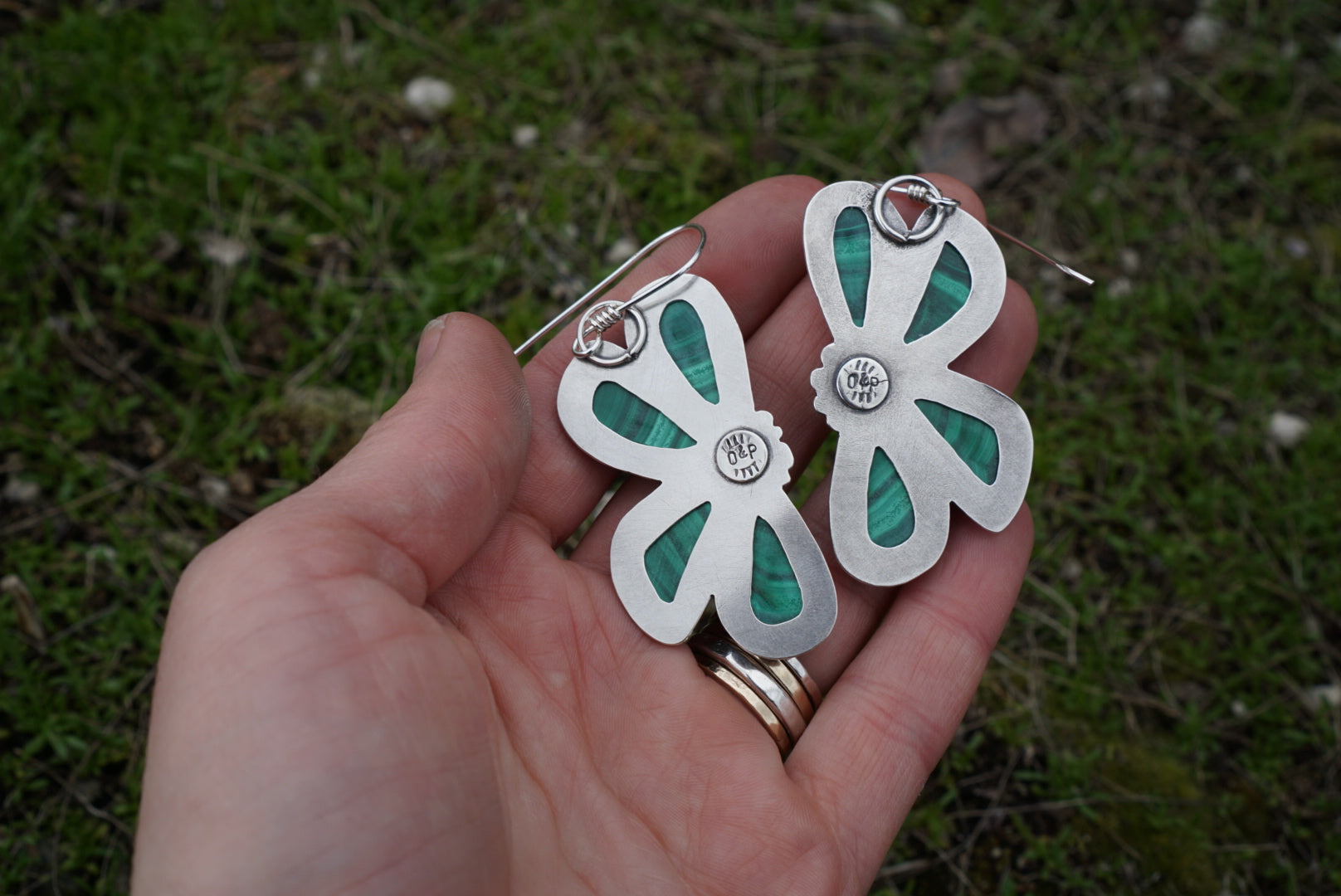 Absolutely stunning pair of earrings featuring gorgeous green Malachite stones in a bloom design with silver ball details. The back of the settings are cut out to let the stones be enjoyed from both sides and to make the earrings lighter and more comfortable. These earrings are oxidized and polished for a soft rustic glow and hang about 2.75 inches long.