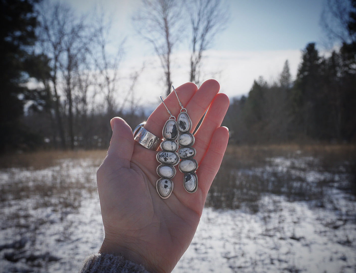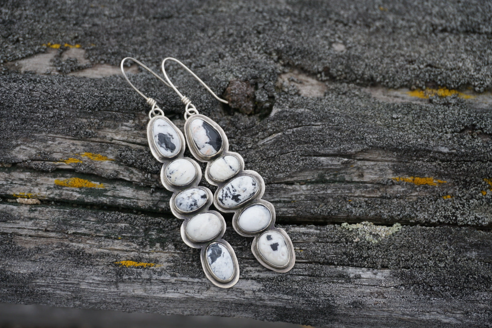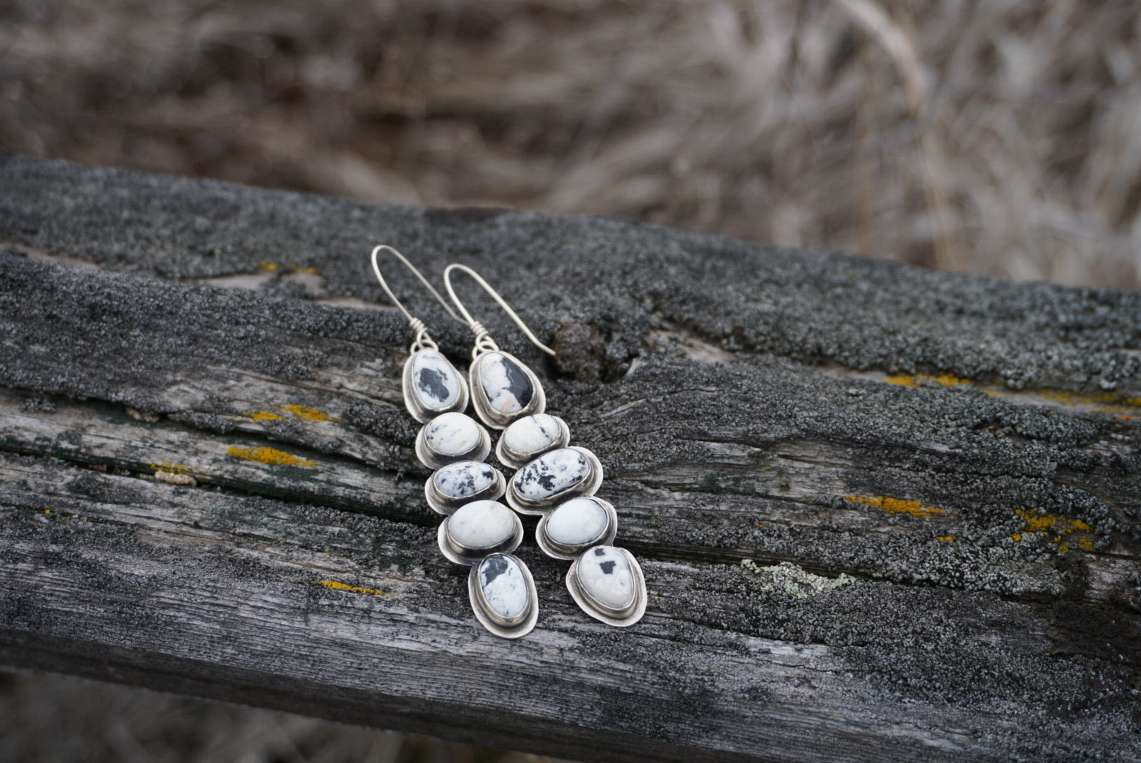 Ten gorgeous White Buffalo turquoise stones are center stage in these amazing earrings. Ten stones!!!! The White buffalo is super high grade and mined in Nevada. Each earring stacks five different stones atop each other and is simply set to honor the beauty of the gemstones. Earrings are oxidized and polished to make the stones stand out and to give a soft glowing finish. Earrings measure about 3.25 inches long and hang from handmade sterling silver earwires.