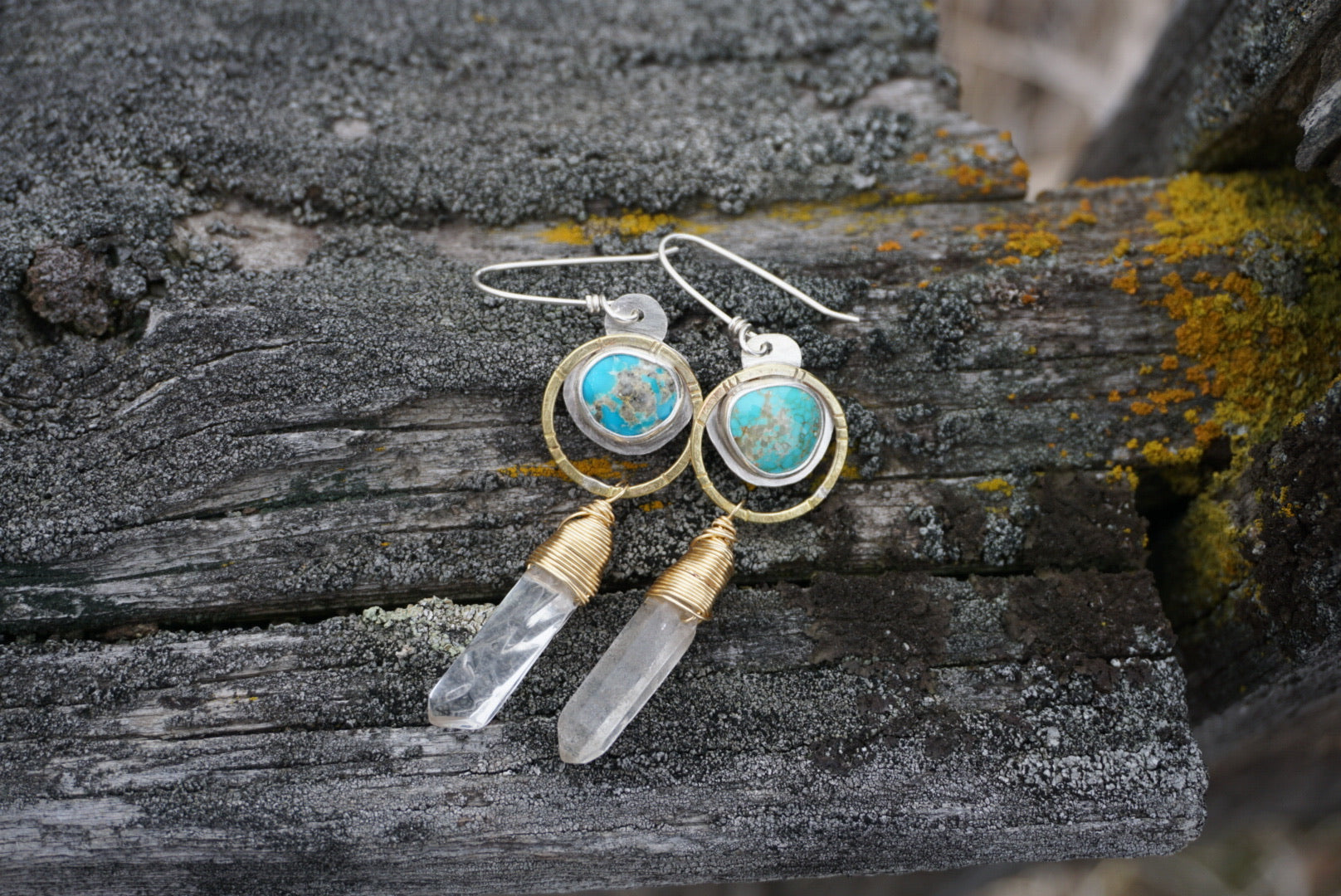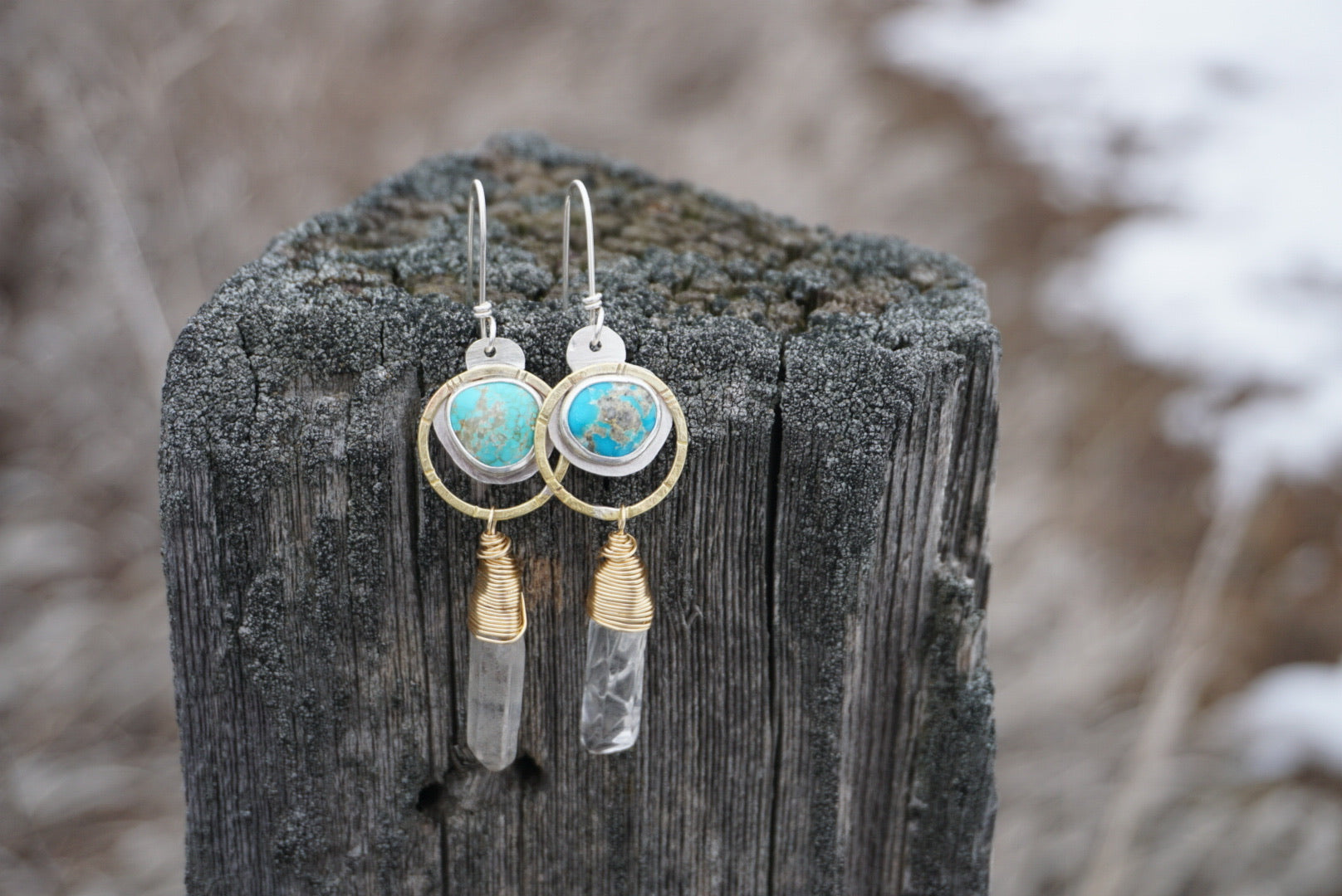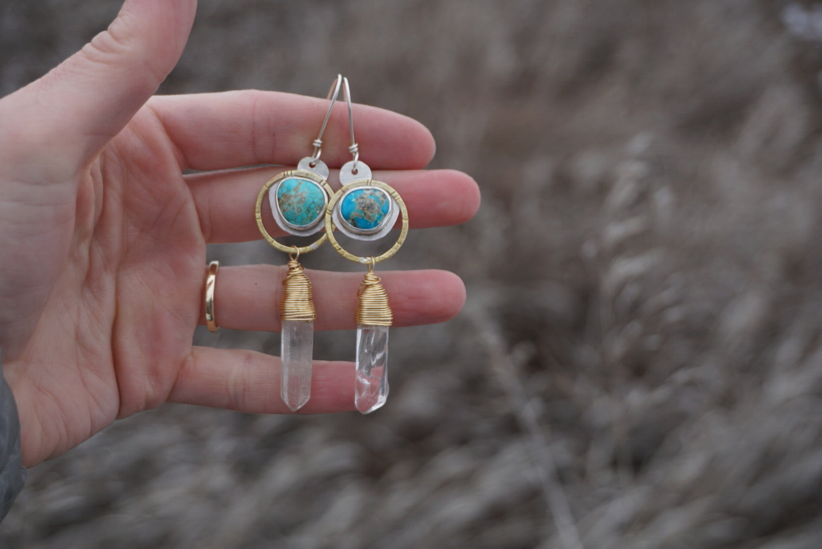 Named Lucent because these truly shine. These earrings are a hybrid of some of my most classic styles. Gorgeous American Mined Turquoise gemstones are simply set in sterling silver with textured brass hoops circling them. Below dangles wire wrapped crystal quartz points. Earrings are finished with handmade sterling silver earwires and measure just over 3 inches in length. Please note, these earrings are constructed with raw stones which can have pitting, inclusions and imperfections that make them unique and beautiful.
