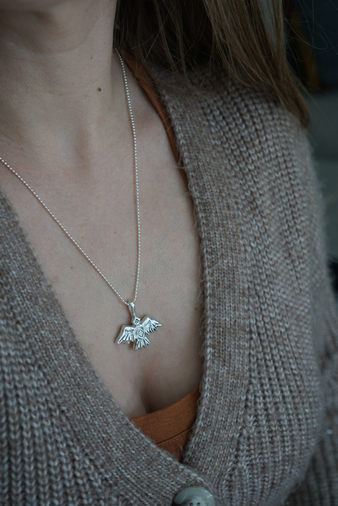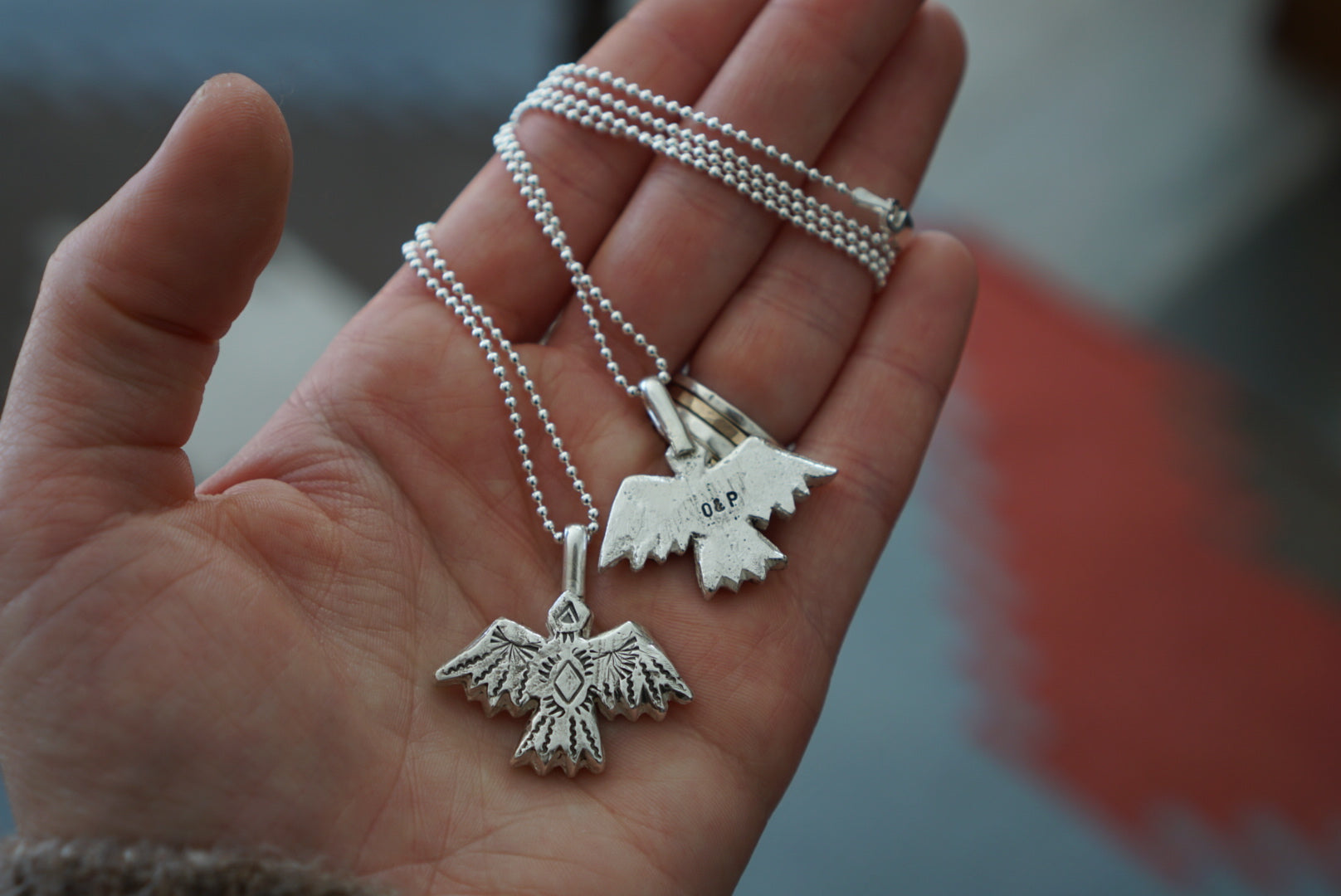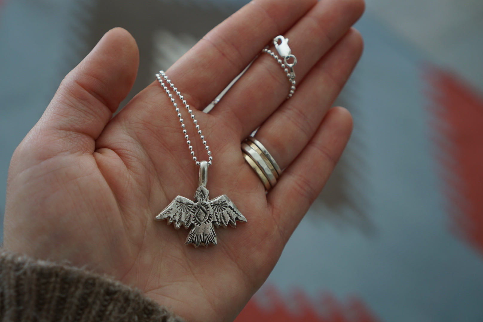 THE best little everyday necklace featuring a gorgeous little heavy duty sand cast Bird of Prey pendant. The bird was carved from wax by yours truly and cast in sand with reclaimed sterling silver. Then, hand stamped and textured for detail. Simple, but so interesting and special this pendant hangs from a dainty yet sturdy sterling silver ball chain measuring 20 inches.
