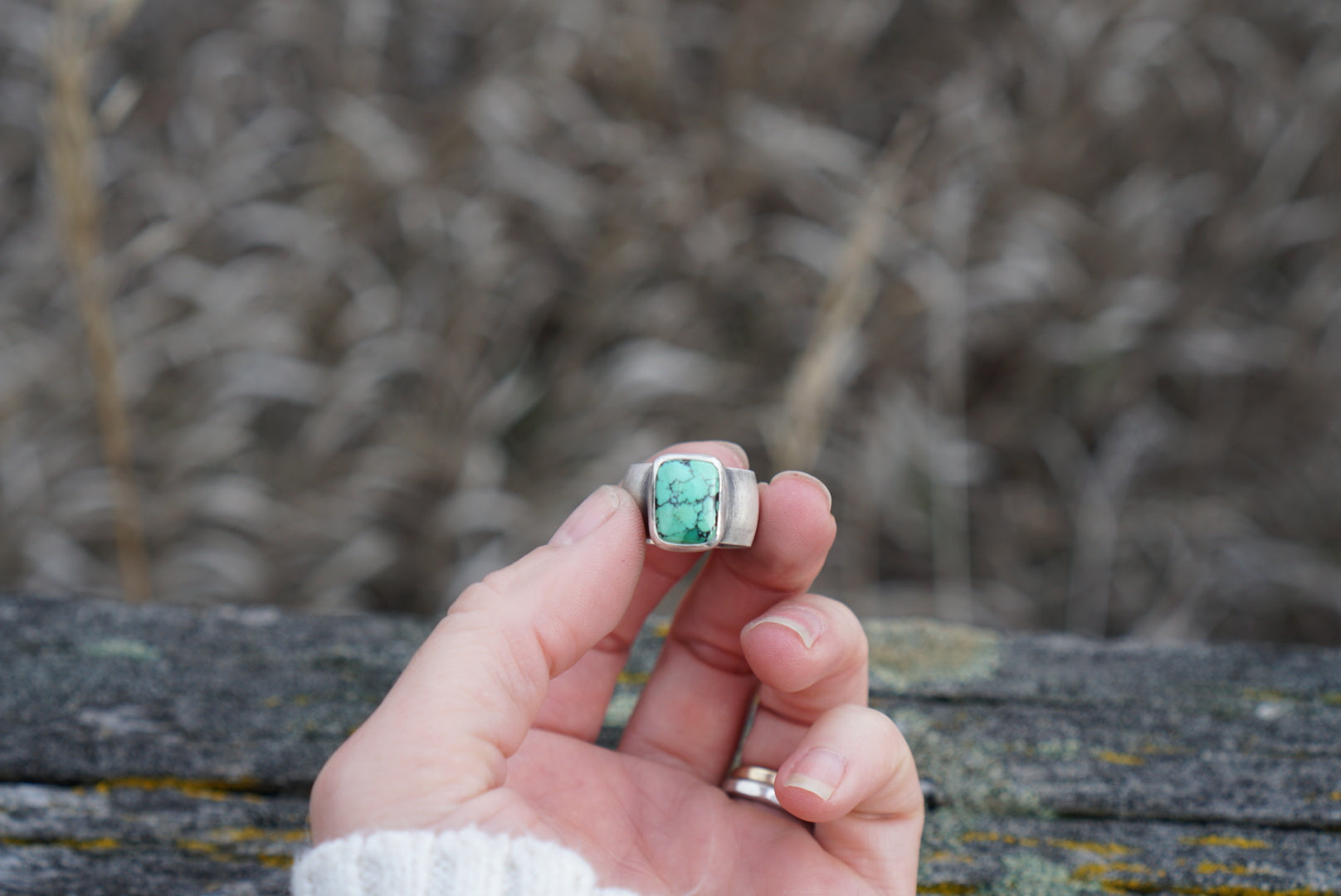 This gorgeous thick and hefty ring features a beautiful thick slice green and webby matrix American mined Turquoise. The chunky gemstone is nestled inside a thick sterling silver bezel and perched a hefty and wide domed ring band creating a sturdy and comfortable fit. The ring band is extra thick and measures a size 5.5.
