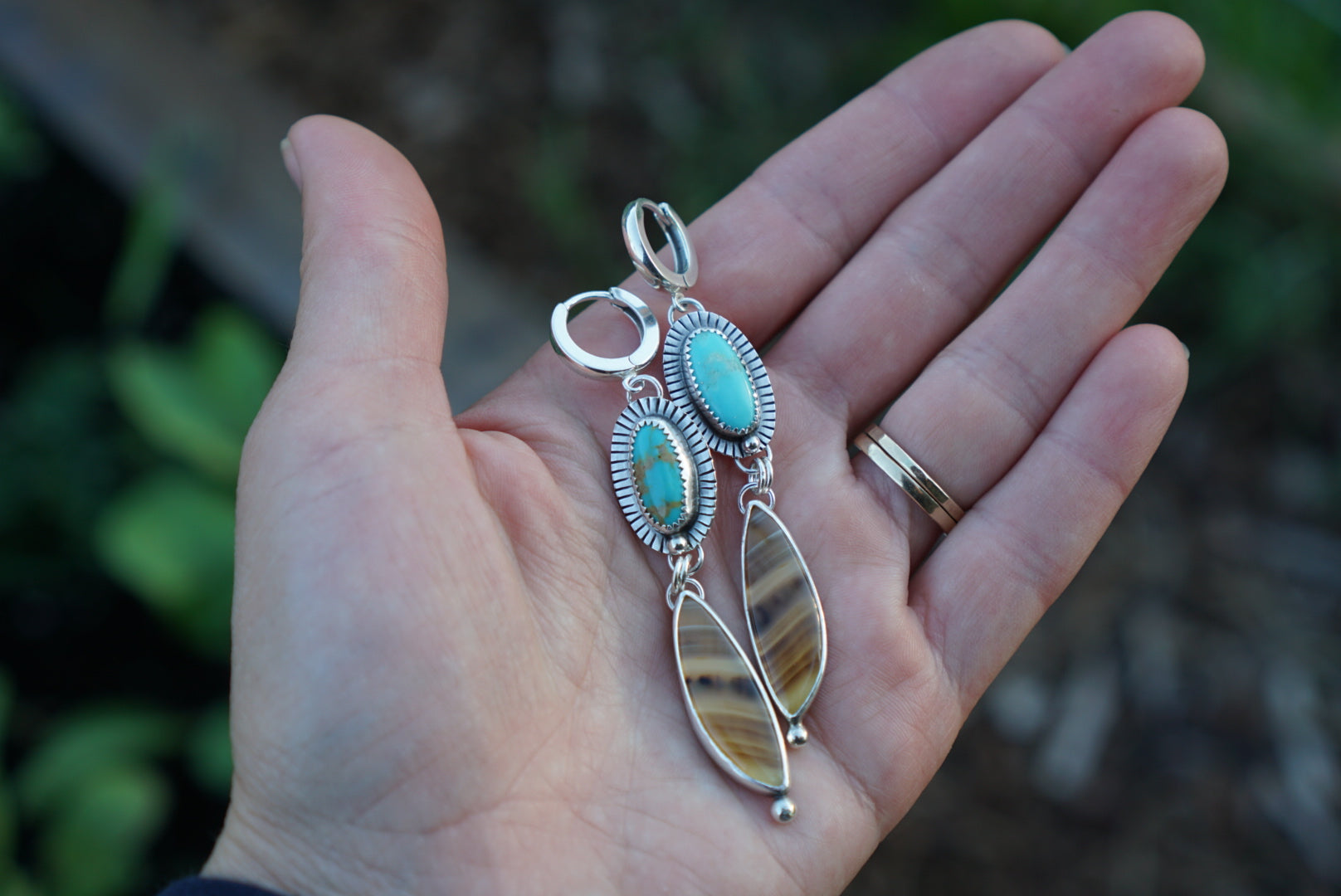 Unique and beautiful huggie hoop earrings! Beautiful slices of Yellowstone Montana Agate are wrapped silver settings and hang below lovely slices of blue Turquoise with sunburst settings. Stones dangle from lever style huggie hoops and are so comfortable to wear. Shiny oxidized and polished finish and complete with Silver dot details. These measure around 2.5 inches long.
