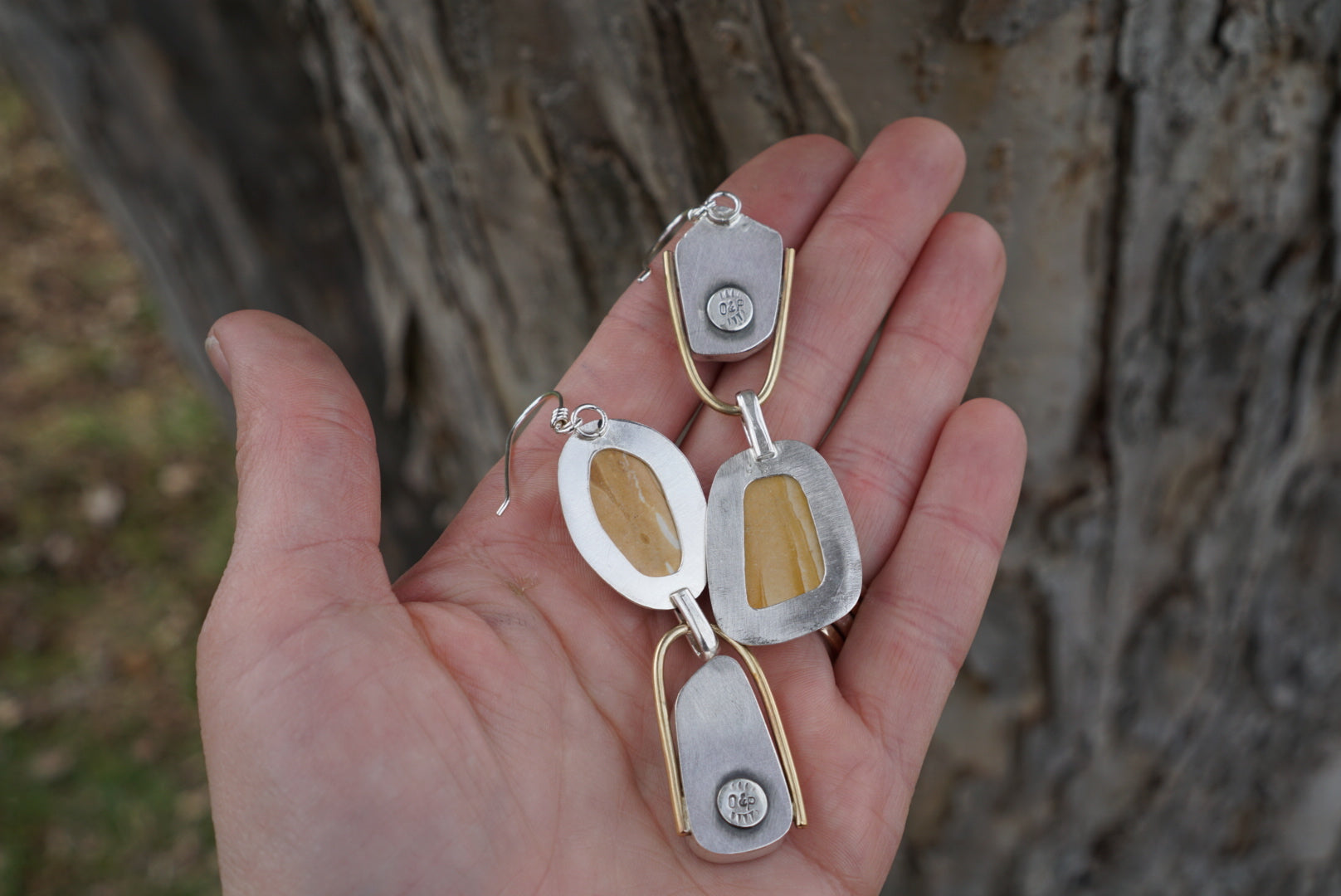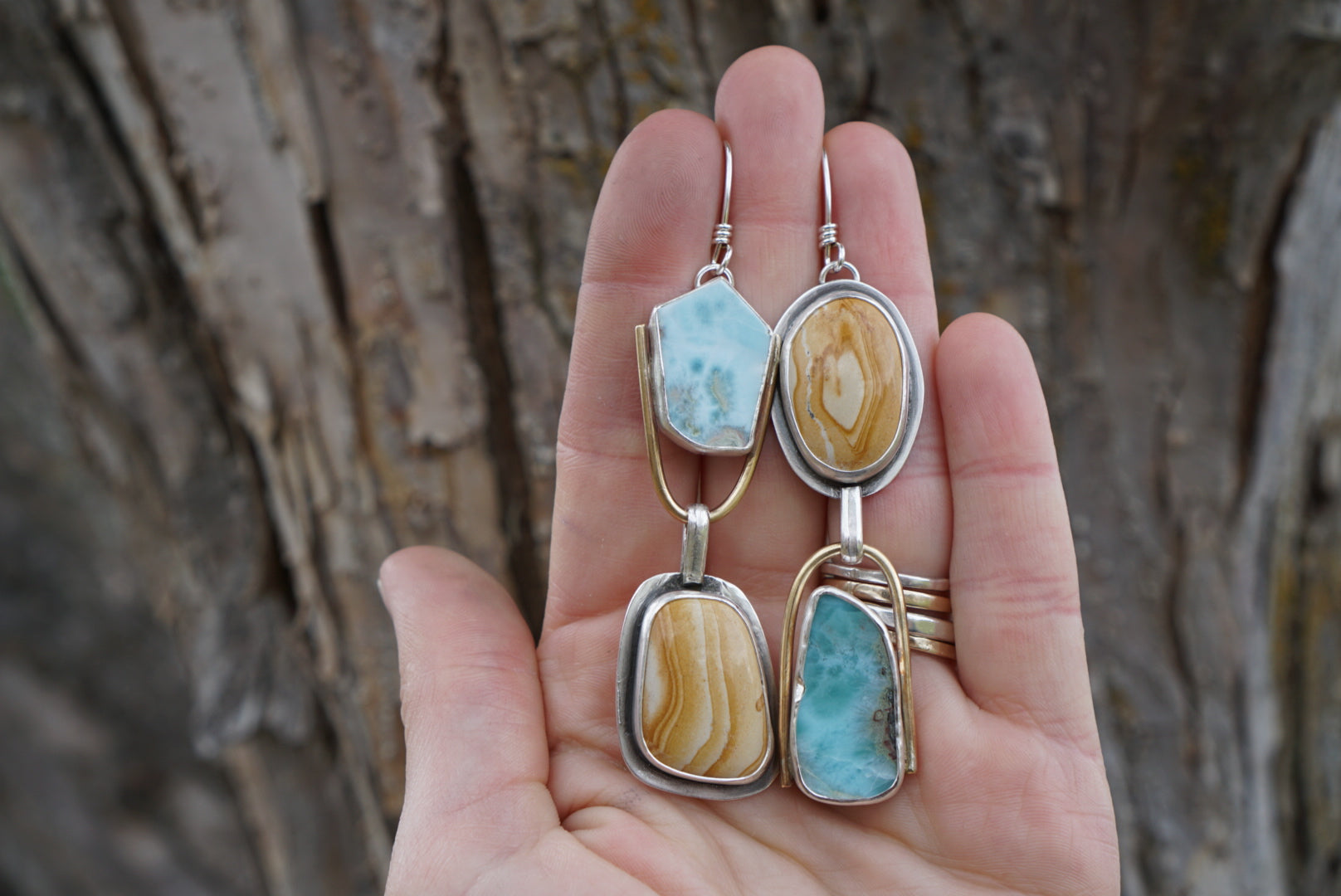 Named Yin Yang for their “balanced contrast”. I love these unique earrings featuring Raw blue and white Larimar nuggets and gorgeous handcut Montana Woderstone. The stones are situated opposite each other creating lovely contrast and compliment, as well as mixed metal details. Earrings are brightly polished and finished with hand crafted sterling silver earwires and dangle about 3.25 inches in length. Please note these are raw and natural stones and will have some inclusions and markings reflecting the raw nature.