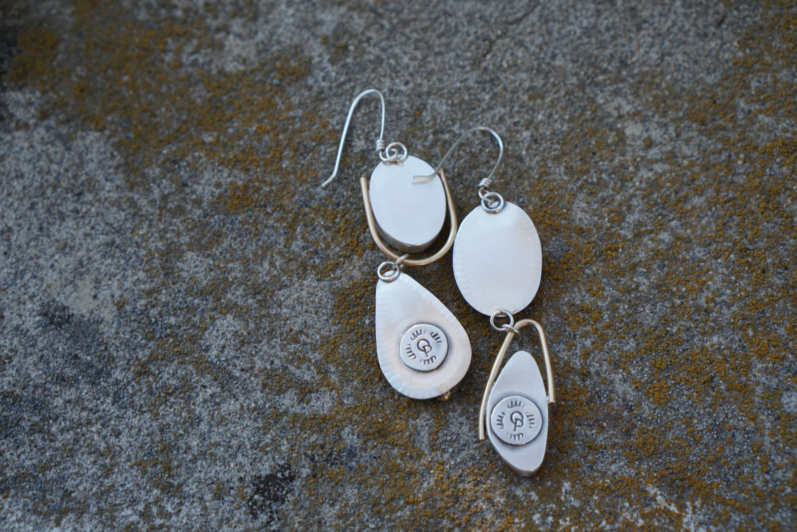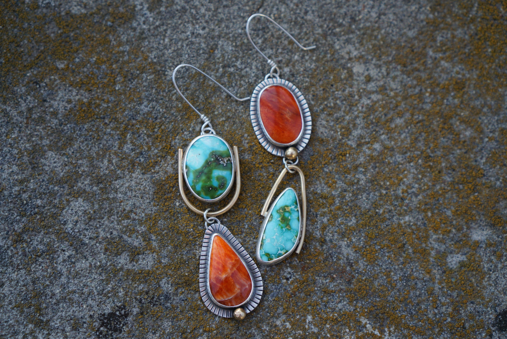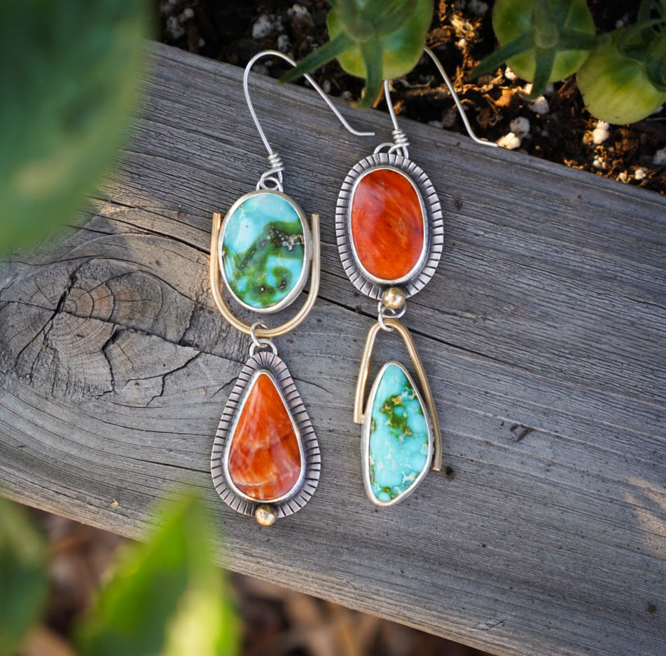 Named Yin Yang for their “balanced contrast”. I love these unique earrings featuring stunning Sonoran Gold Turquoise and bright orange Spiny Oyster Shell. The stones are situated opposite each other creating lovely contrast and compliment. Earrings are oxidized and polished and complimented with mixed metals of sterling silver with jewelers brass accents and are finished with hand crafted sterling silver earwires and dangle just about 3.5 inches in length. Beautiful statement earrings.
