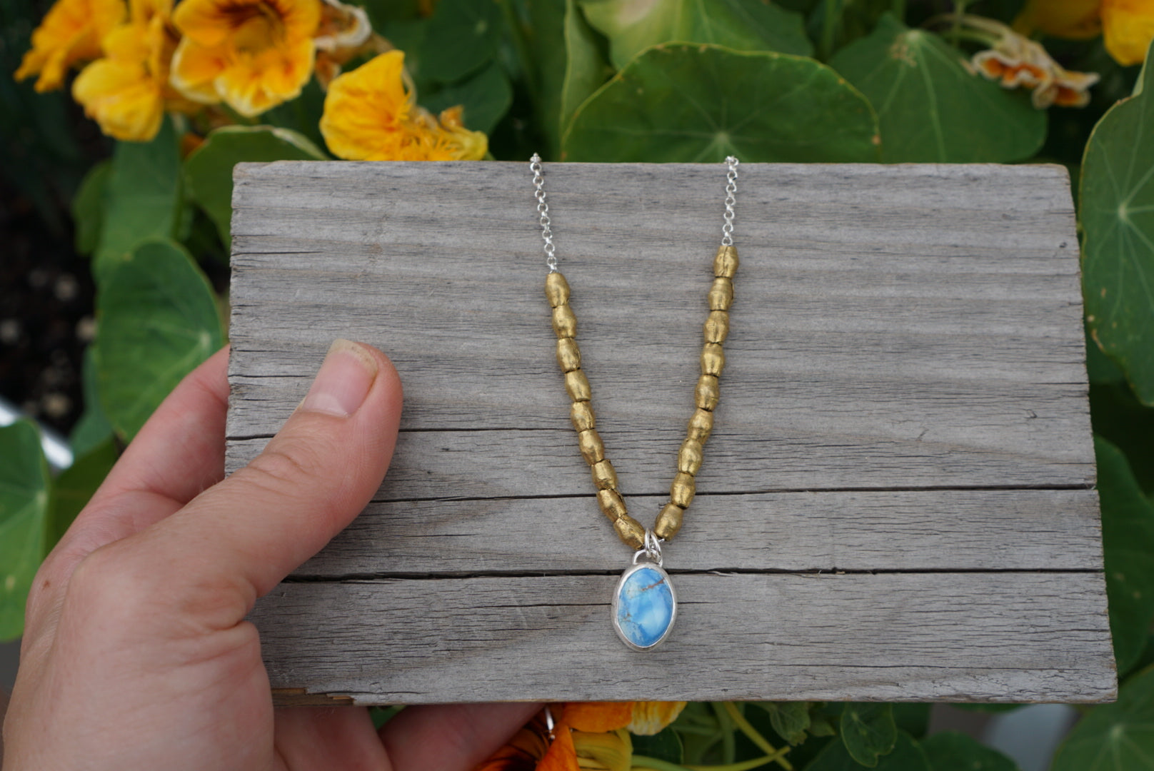 THE Cutest everyday choker necklace featuring a gorgeous little piece of American Lavender Turquoise. This necklace is absolutely perfect for everyday wear and for layering. Turquoise is simply set in fine and sterling silver and hangs from a dainty but sturdy 14.5 inch sterling silver rolo chain with 2 inch extender to adjust length up to 16.5 inches and complete with unique brass African Trade Beads on the chain for extra detail.