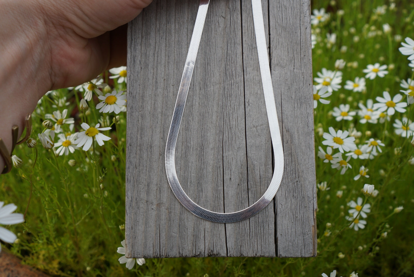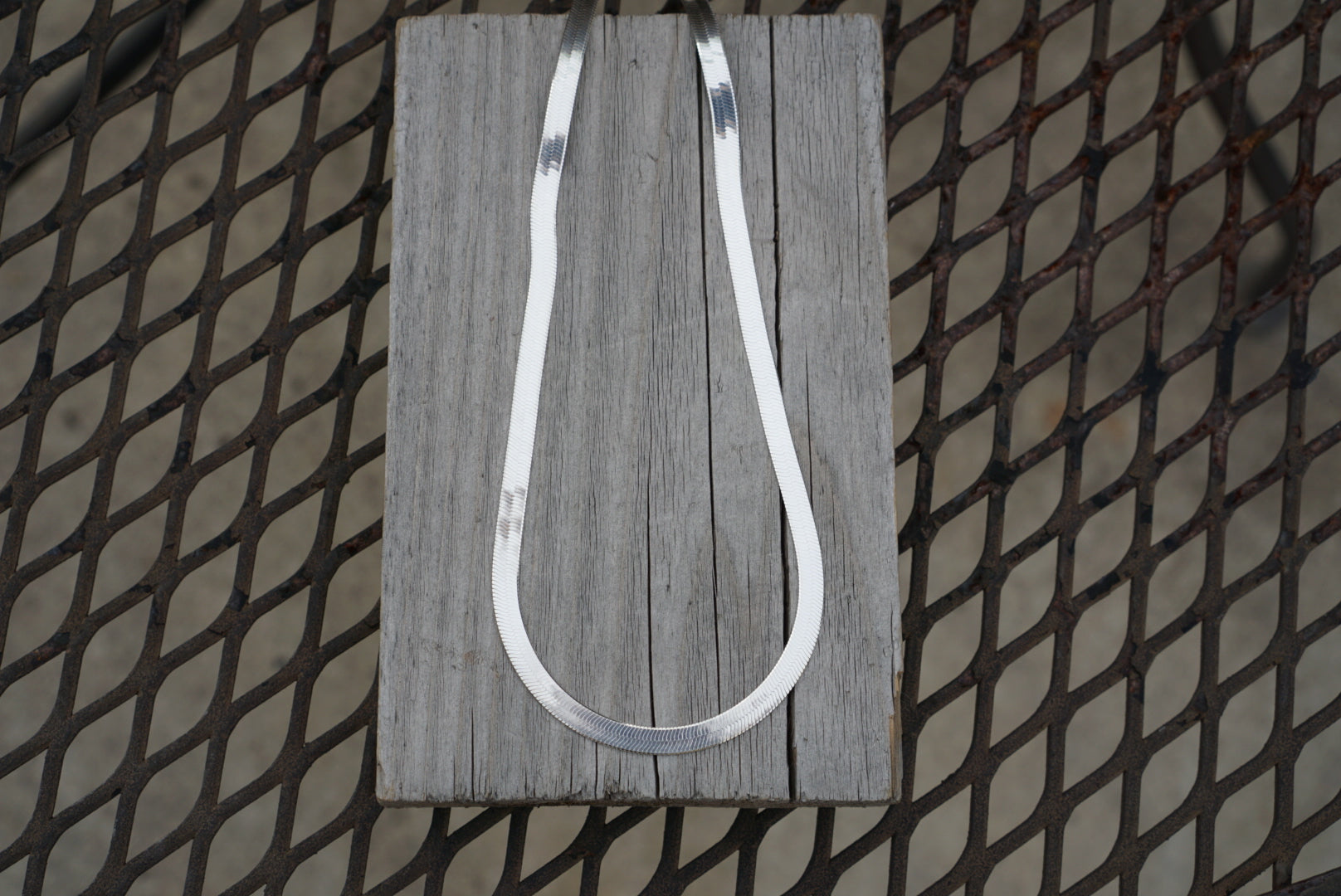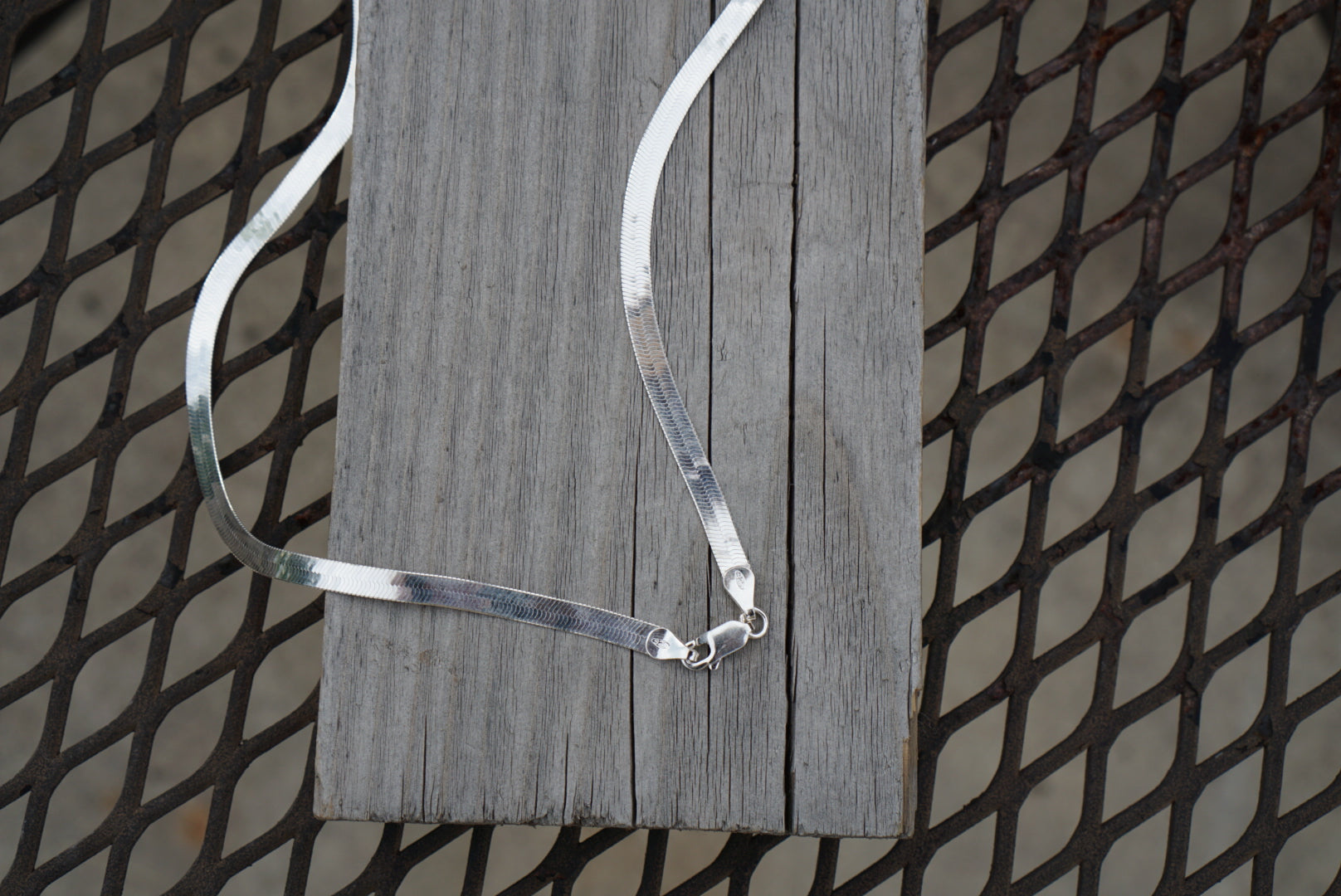 A simple thick Herringbone necklace. Sterling Silver. 18 inches in length. Great to wear solo or layered with other necklaces. Lobster clasp closure.