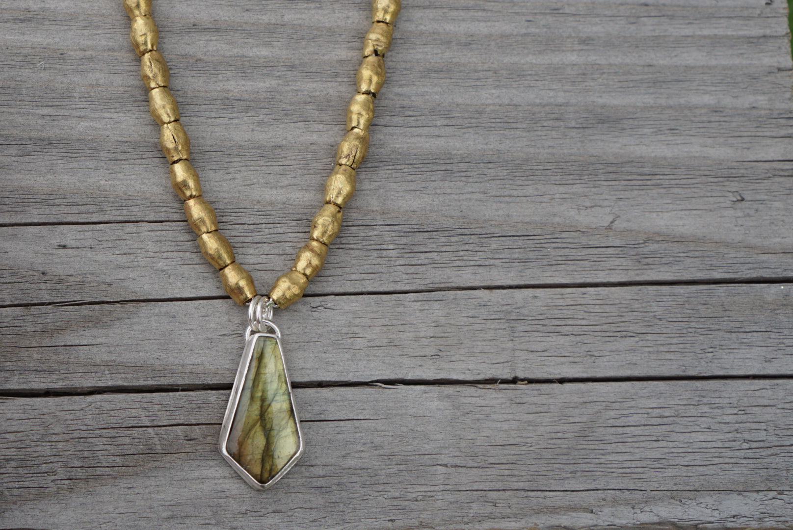 THE Cutest everyday choker necklace featuring a gorgeous little piece of Labradorite. This necklace is absolutely perfect for everyday wear and for layering. Turquoise is simply set in fine and sterling silver and hangs from a dainty but sturdy 16 inch sterling silver rolo chain with 2 inch extender to adjust length up to 18 inches and complete with unique brass African Trade Beads on the chain for extra detail.
