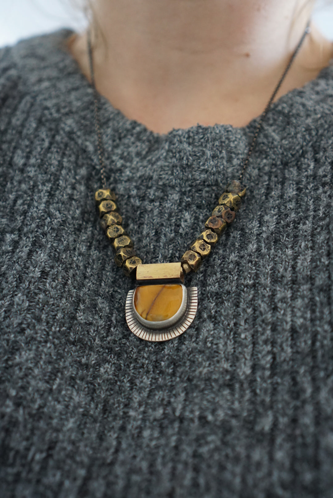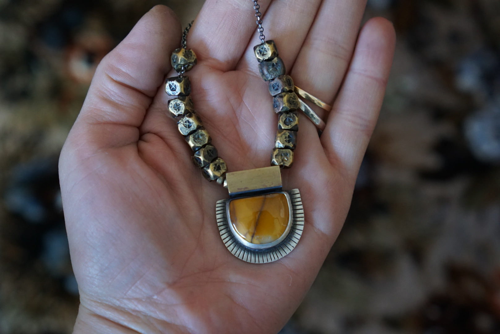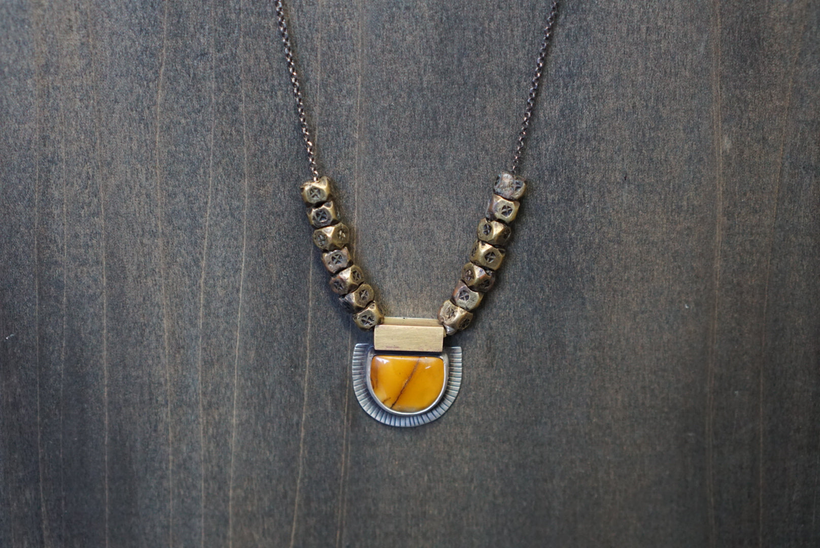 An amazing statement necklace featuring a pendant made of a gorgeous hunk of half moon shaped mustard yellow Mooakite set in sterling silver with hand stamped details along the edge and finished with a square tube bail. The pendant is strung on a dainty but sturdy black oxidized sterling silver rolo chain with hand crafted and stamped chunky brass African Trade beads strung on the chain for extra pizazz. This necklace is beautiful, earthy and unique. It measures 19 inches in length and is finished with a lobster clasp.