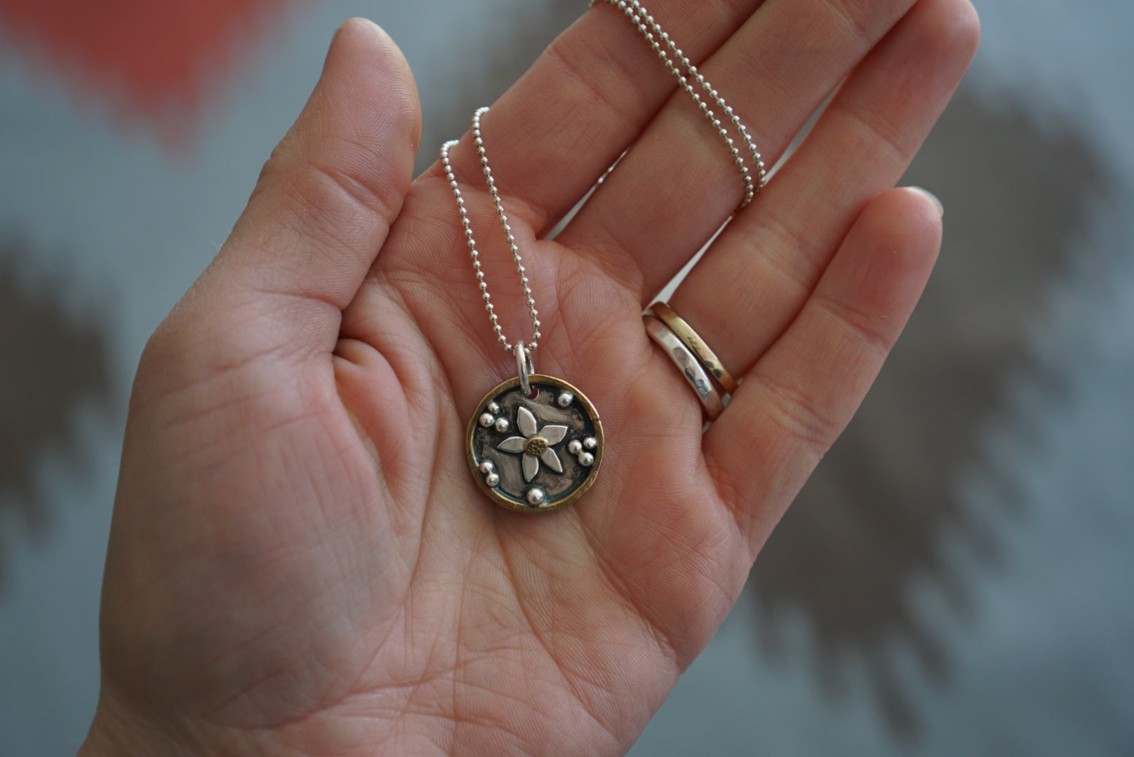 THE Cutest little everyday necklace featuring a gorgeous little flower charm made with sterling silver and brass. Completely hand crafted and Bloom stamped on the back. This necklace is absolutely perfect for everyday wear and for layering. Charm pendant hangs on a dainty but sturdy 18 inch sterling silver ball chain.