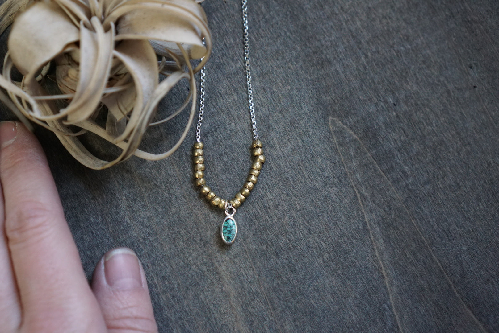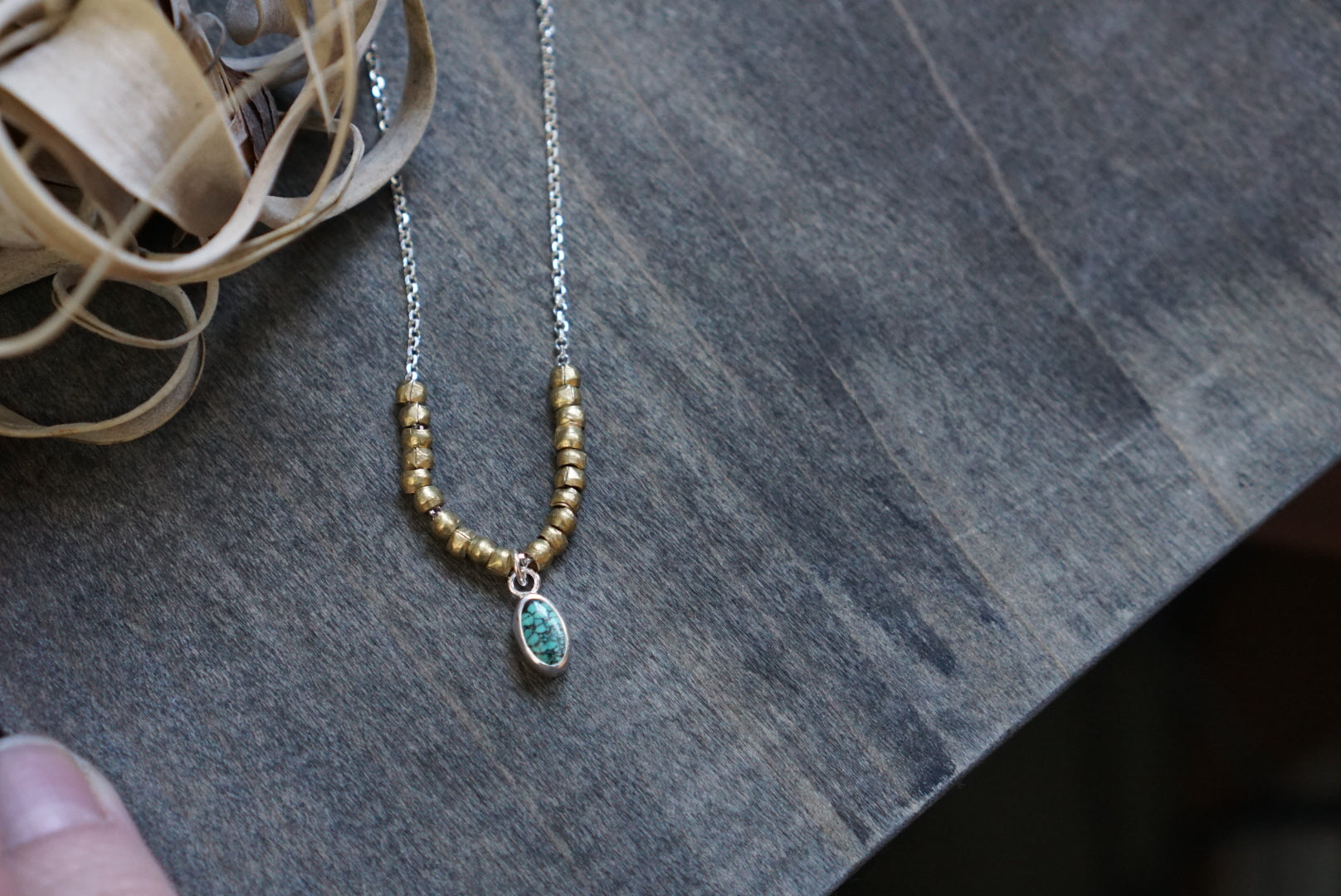 THE Cutest little everyday necklace featuring a gorgeous little piece of American Turquoise. This necklace is absolutely perfect for everyday wear and for layering. Turquoise is simply set in fine and sterling silver and hangs from a dainty but sturdy 18 inch sterling silver rolo chain complete with unique brass African Trade Beads on the chain for extra detail.