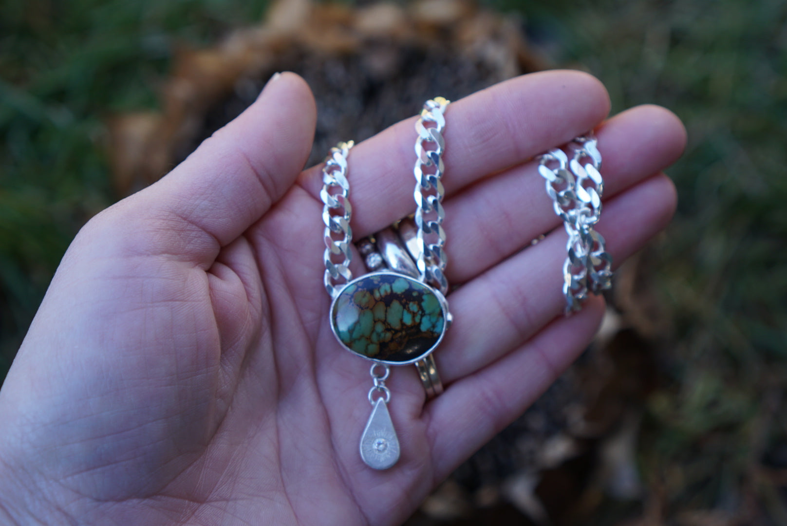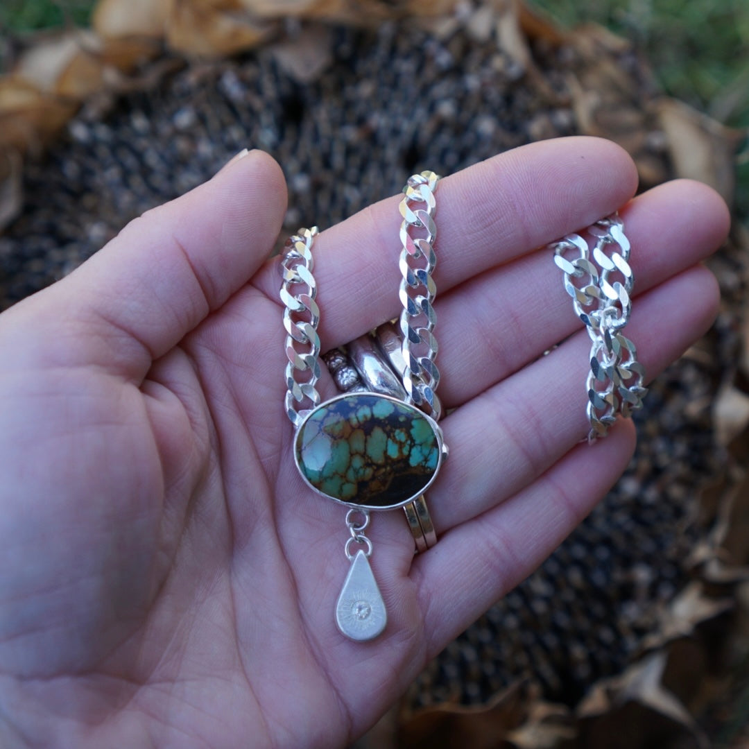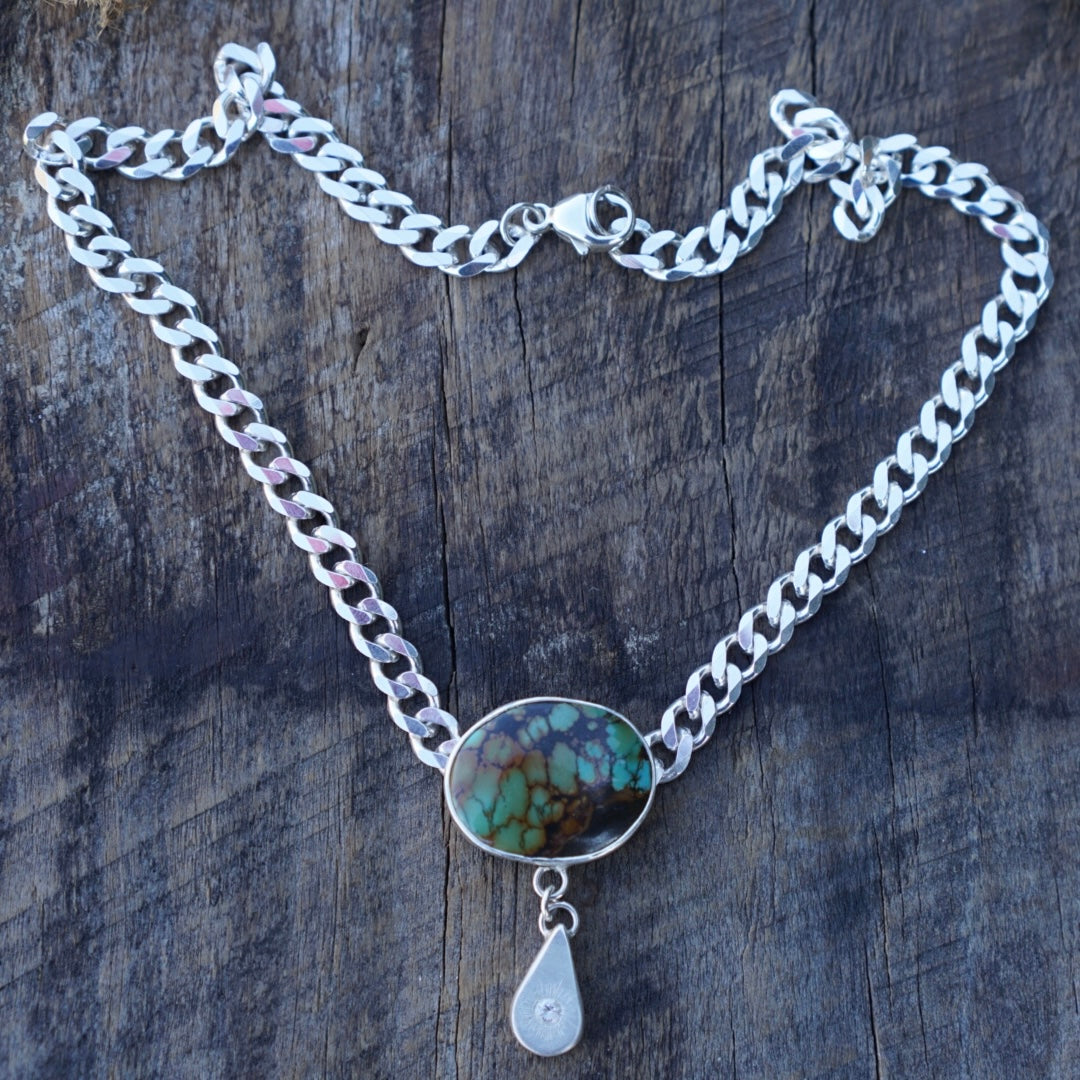 An amazing and eye catching necklace featuring gorgeous and sturdy Turquoise stone suspended on an extra thick and hefty sterling silver curb chain.  Below the stone dangles a hand forged and reclaimed teardrop with a flush set cubic zirconia with sunburst etching. The Necklace measures 14.5 inches long and is finished with lobster clasp.