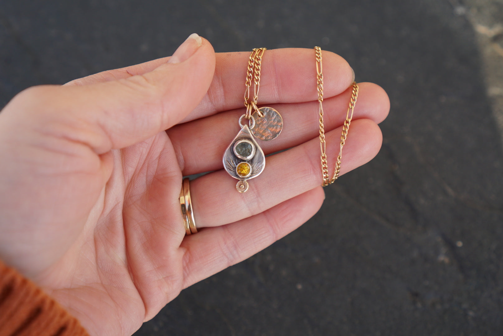 Double Sapphire Necklace: Reclaimed Sterling silver, light green raw MT Sapphire paired with a faceted yellow MT Sapphire, 14k Gold ball accent, 14k Gold fill disc charm on a 14k Gold fill Figaro Chain... $385
