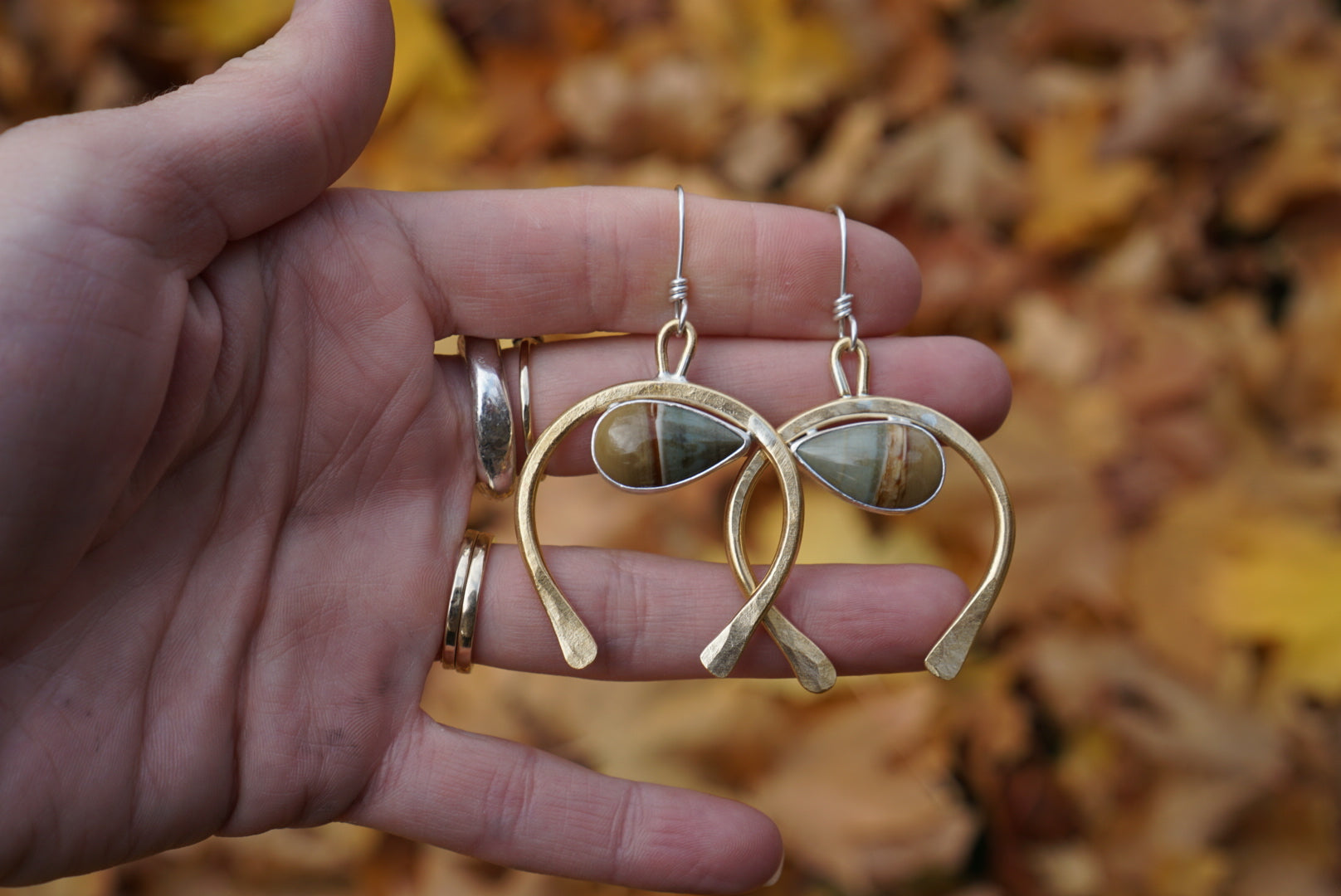 Hand shaped and hammered brass horseshoe shaped loops with beautiful scenic Jasper stones set in sterling silver perched at the top of the arch. Beautiful Autumn colors. These earrings measure about 2.5 inches long and dangle from handmade sterling silver earwires.
