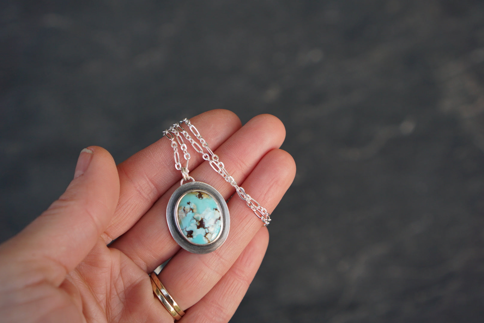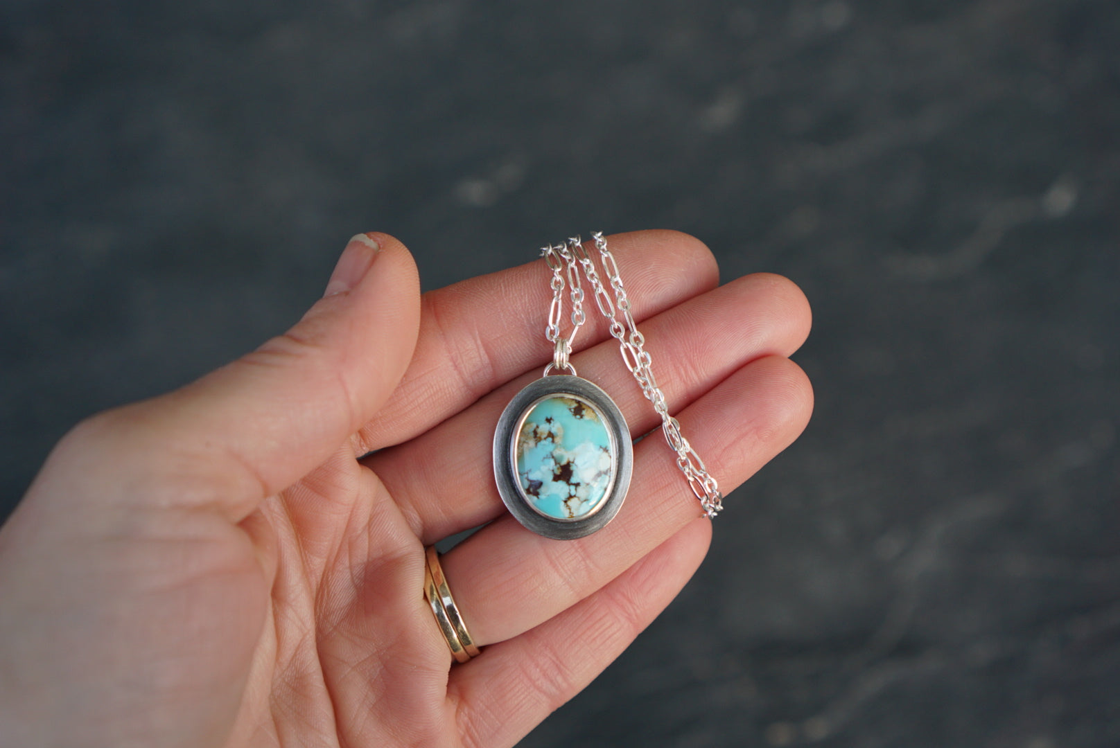 A wonderfully simple necklace and perfect for the everyday, this beauty features a Golden Hills Turquoise gem with stunning matrix of robins egg blue, ochre, cream and deep brown. It's set simply and beautifully in silver. The pendant hangs from a sturdy long and short style link chain that measures 18 inches long.