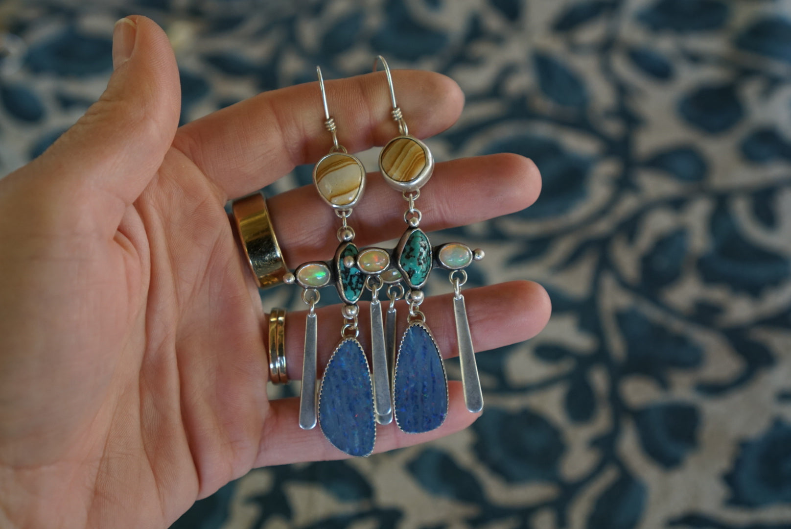 Amazing statement earrings made with gorgeous Wonderstone gems dug and cut in Montana, Ethiopian Opals, Alacron nugget Turquoise and Australian Opal doublets. These are one of a kind. Finished with silver ball and paddle fringe, these are sure to catch people's eye. Earrings dangle almost 3.5 inches in length and hang from hand crafted sterling silver earwires.