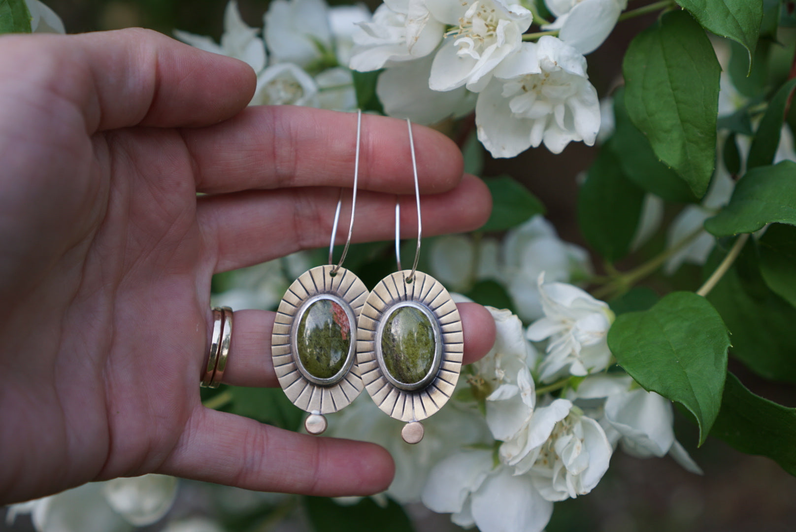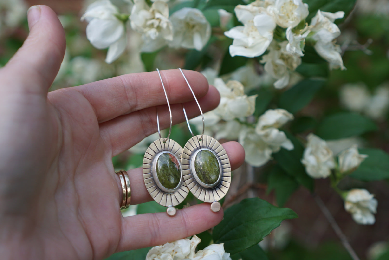 Simple and stunning. This pair features beautiful Unakite stones simply set in sterling silver and perched atop brass discs with hand stamped sunburst details. These dangle from long Sterling silver loop hoop earwires. Earrings dangle about 2.75 inches from the top of the earwire to the base of the stone and are finished with rubber stoppers to keep the hoops in place. Brass is also subject to oxidation and will naturally darken with time. I love how brass looks as it ages, but if it’s not for you, polish on a regular basis to keep them shiny.