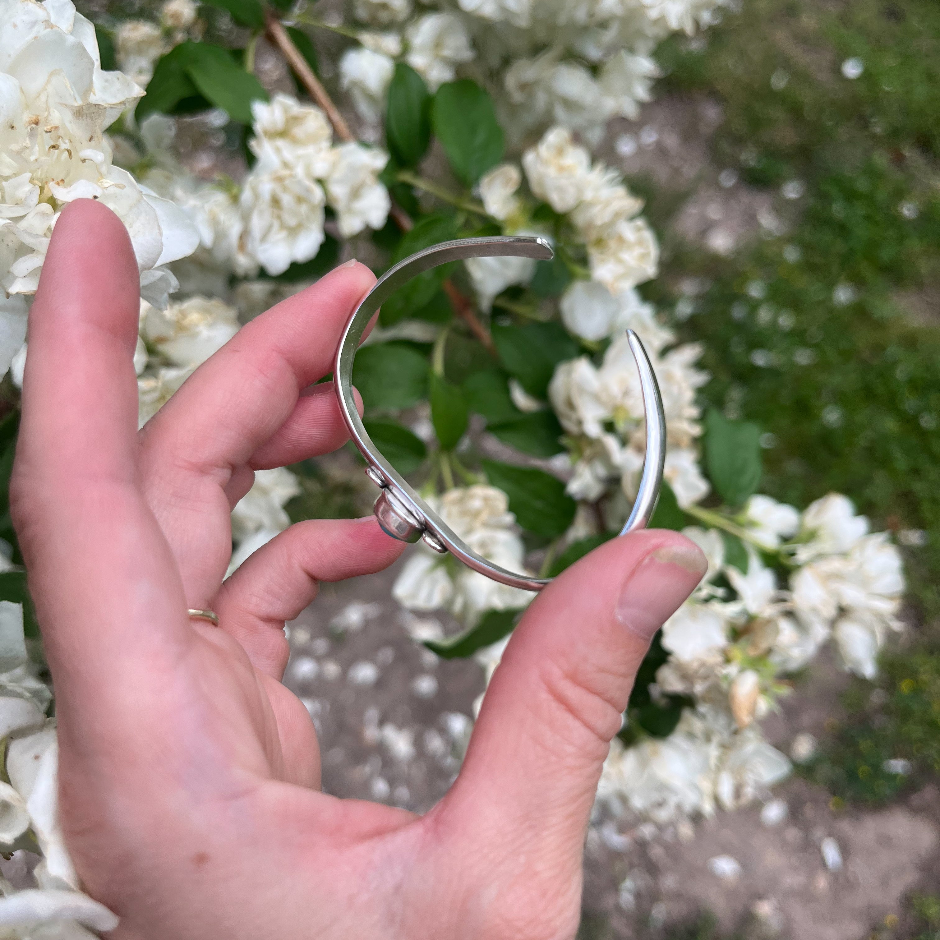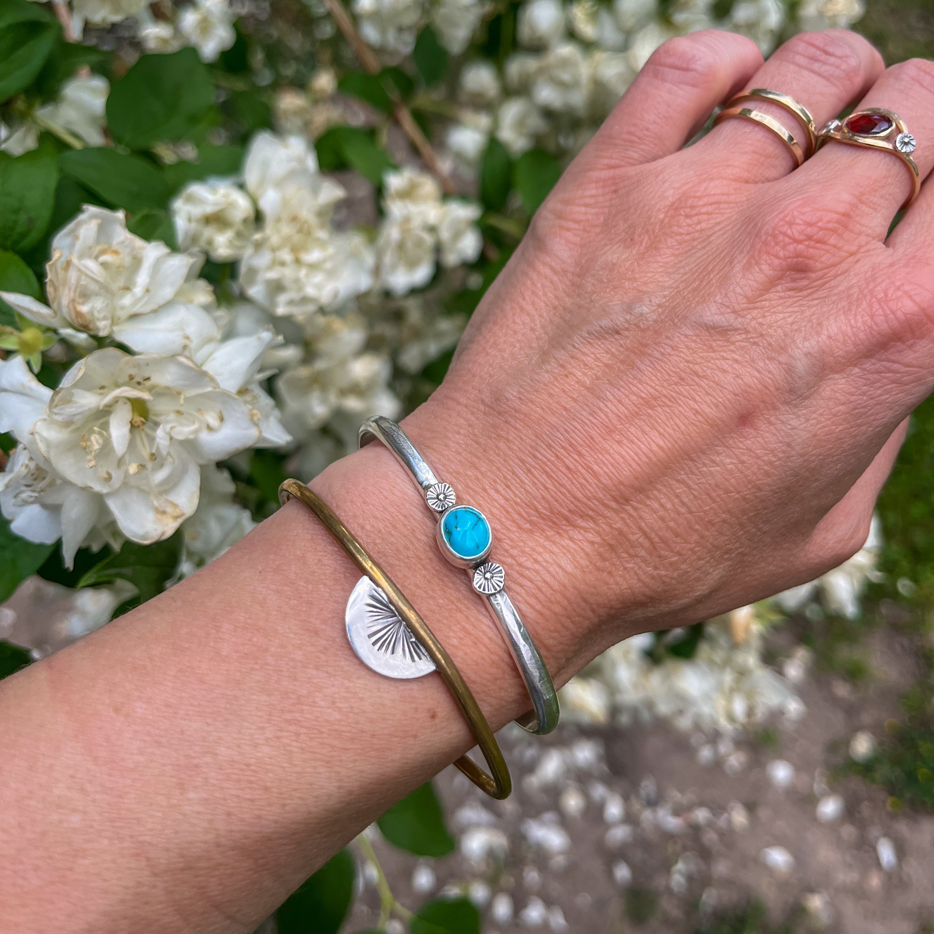 This gorgeous little cuff is perfect for stacking and everyday wear. Featuring a sturdy half round bracelet with a stunning piece of blue Kingman Turquoise perched between two hand stamped flower burst accents. Oxidized and polished for a soft rustic glow. Cuff Is one size fits most and measures 5.5 inches and can be stretched open Or squeezed shut for your perfect fit.