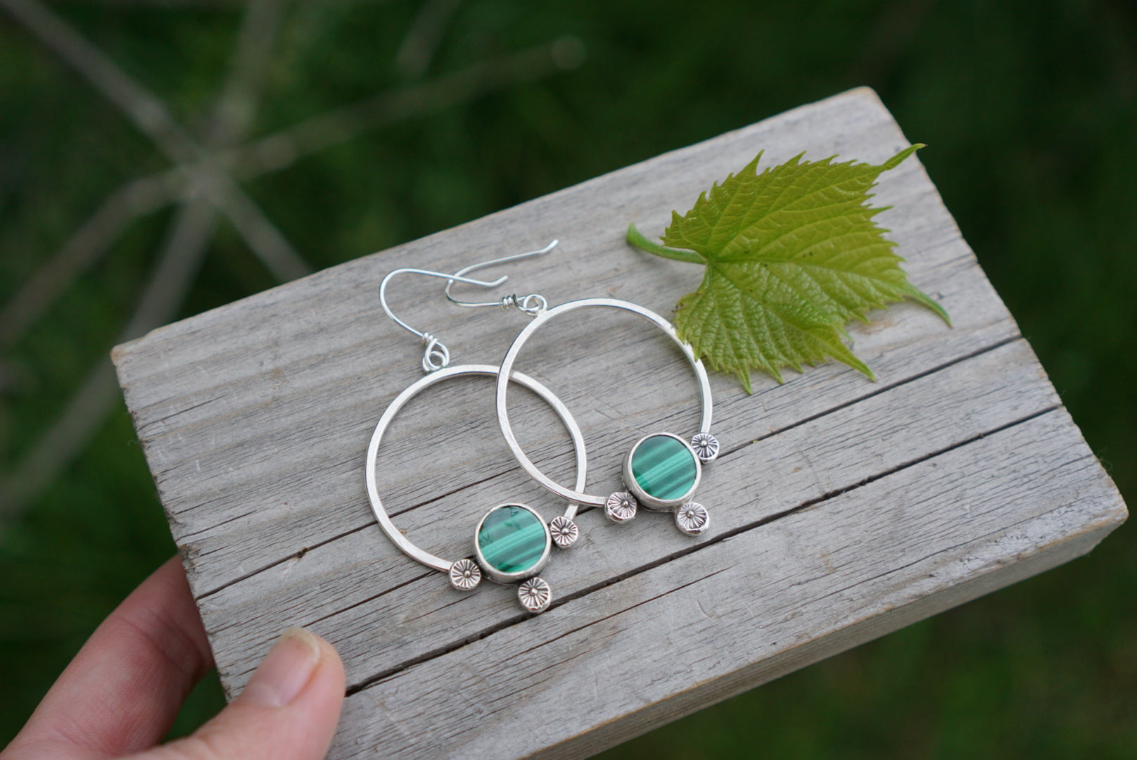 Beautiful medium sized everyday hoops featuring gorgeous deep green striped Malachite gemstones. Earrings are completely handmade from fine and sterling silver with sterling silver hoops and little hand stamped ball details around the stones. These dangle from handmade sterling silver earwires. Hoops measure just over 1 inch in diameter and earrings hang almost 2.5 inches long and are extra light and comfy for everyday wear.