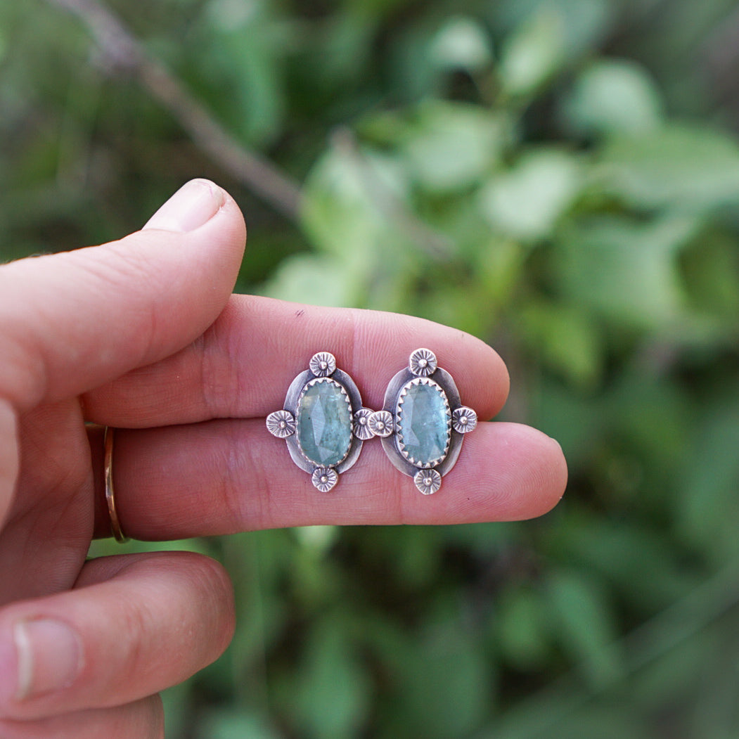 Gorgeous little posts perfect and comfortable for the everyday. Made with fantastic slices of icy blue rose cut kyanite gemstones that are simply set in sterling silver with hand stamped floret details on each side of the stones. Finished with sterling silver posts and sterling silver earnuts.