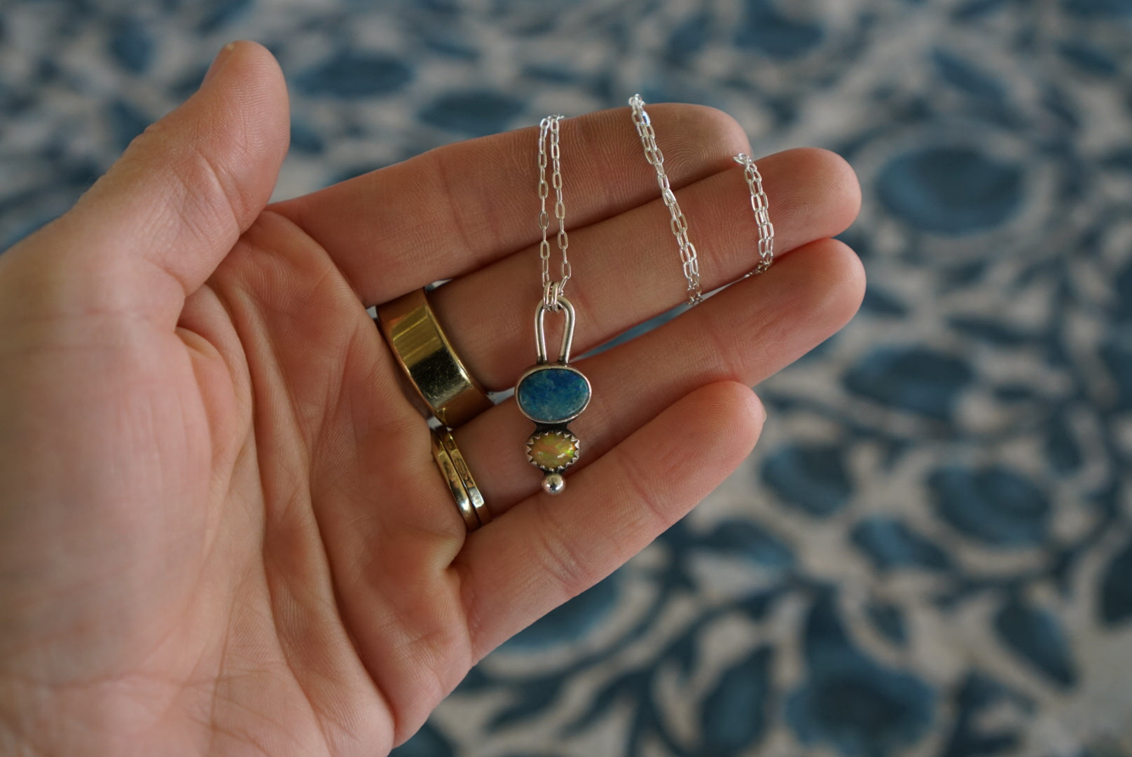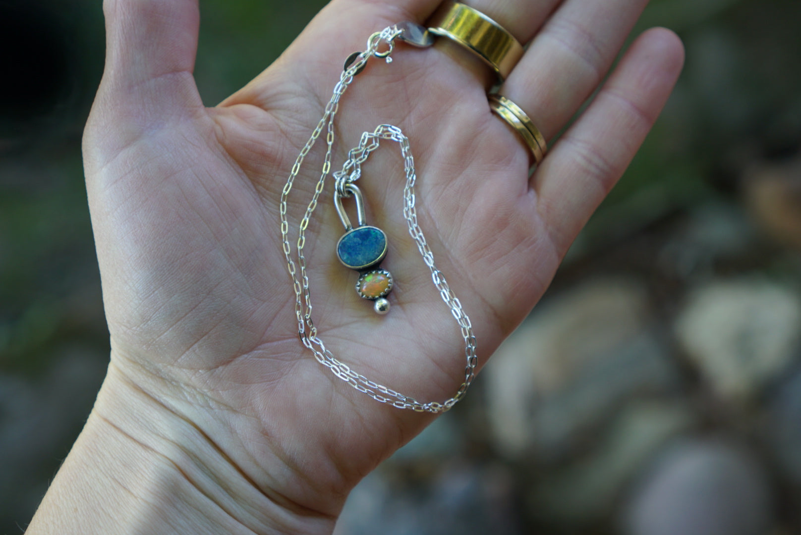 The sweetest little pendant necklace featuring Australian and Ethiopian Opals stacked with a little silver ball detail and chunky bail. This cute little pendant hangs from a dainty 16 inch sterling silver cable chain.