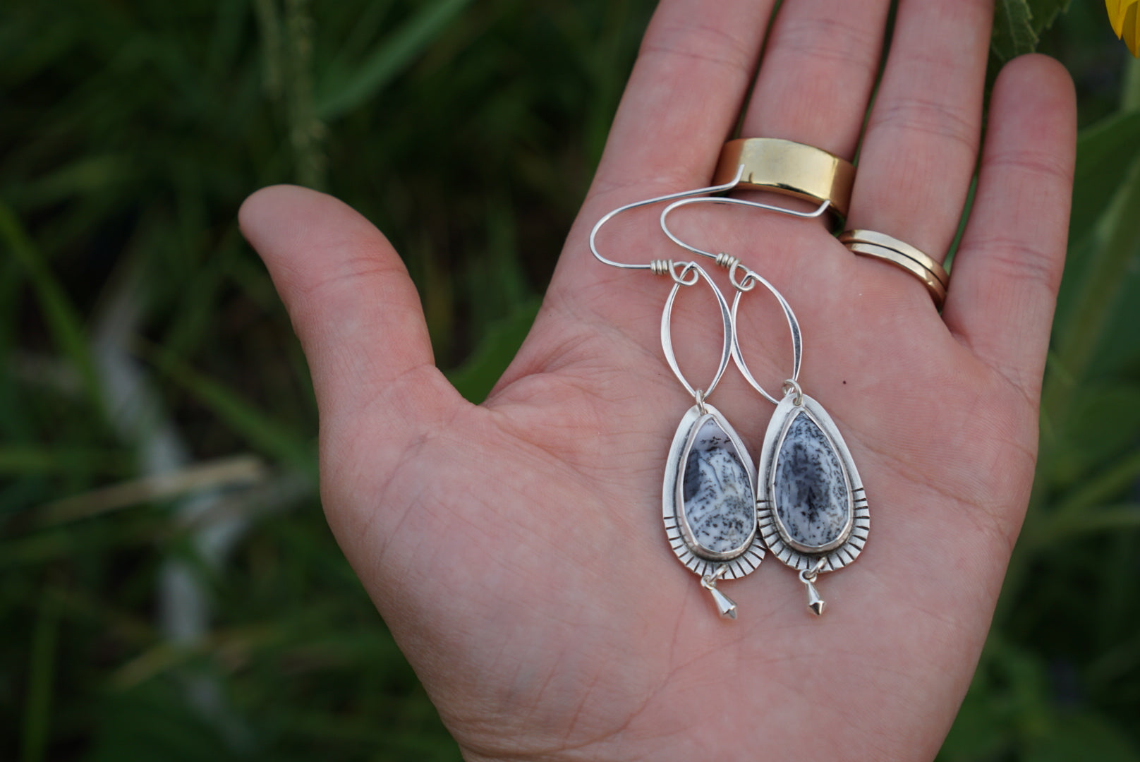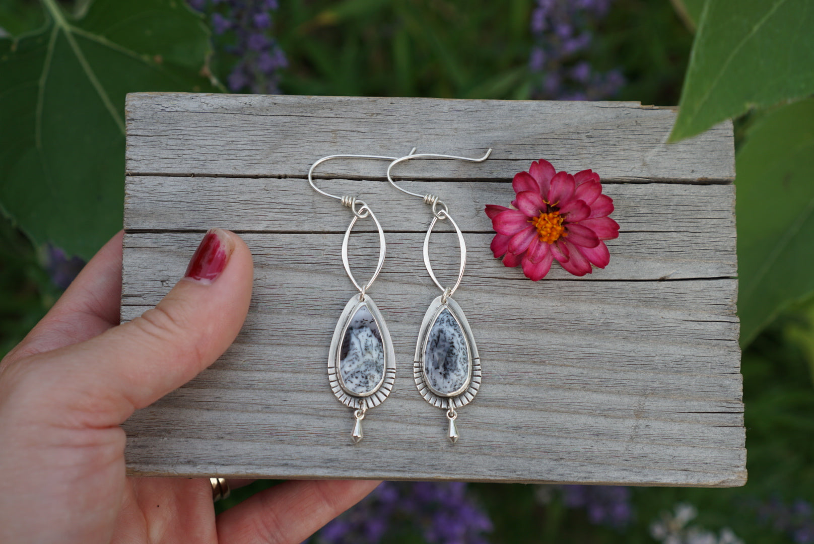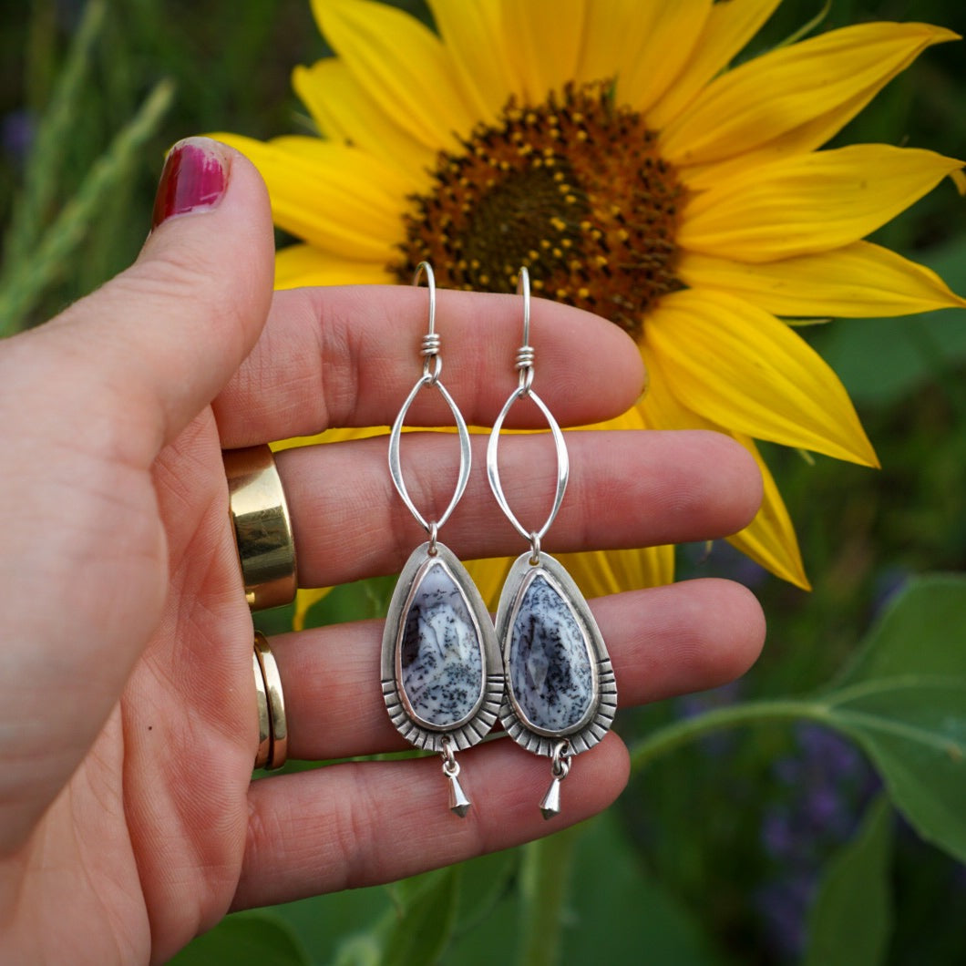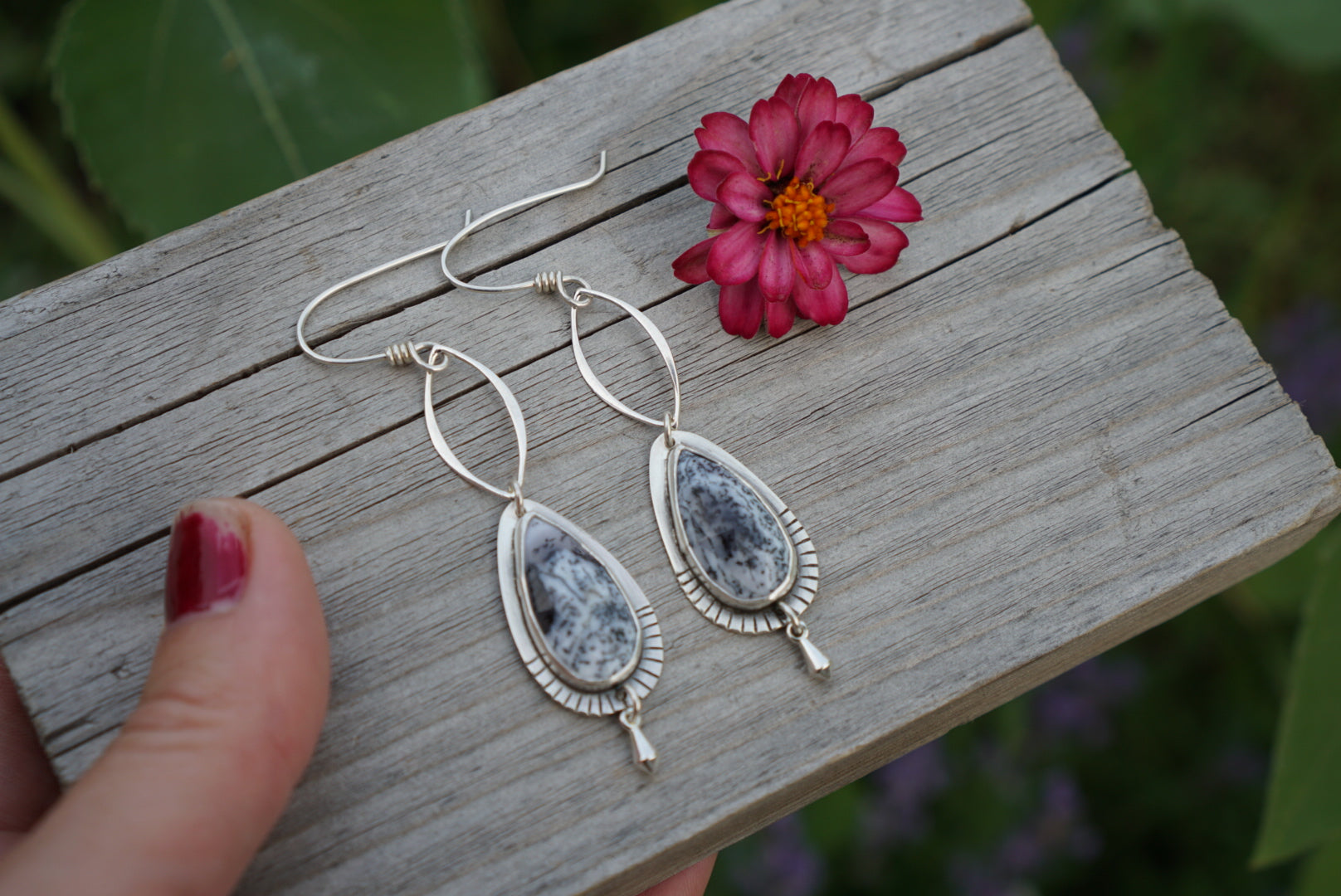 These earrings are the newest edition of an old classic design of mine. They feature sterling silver almond shape hoops with white and black Dendritic Agate gemstones wrapped in sterling silver with hand stamped details and little silver drops dangling below. They hang from hand crafted sterling silver earwires and measure about 2.75 inches long and are light and comfy on the ears.
