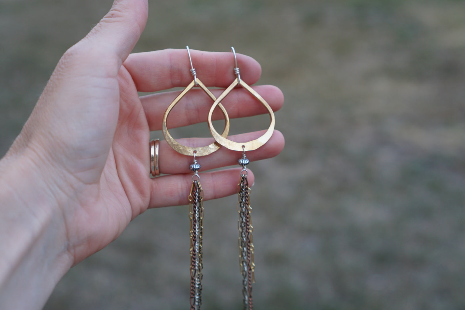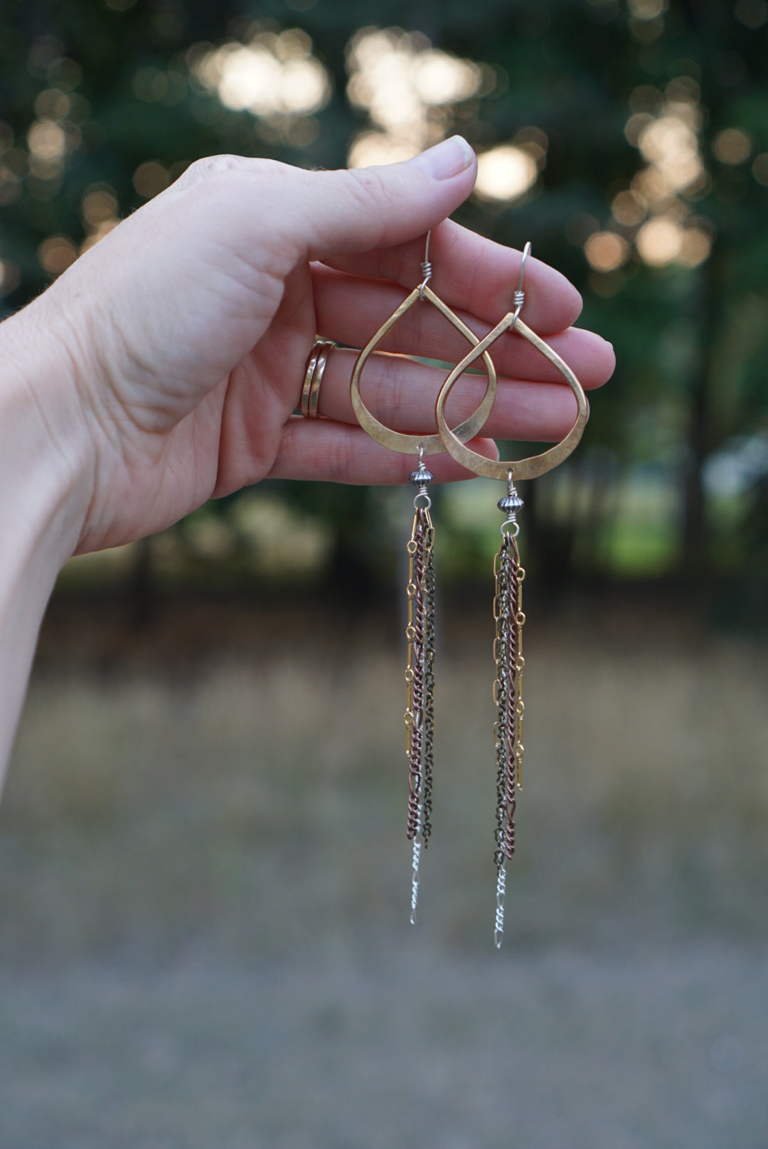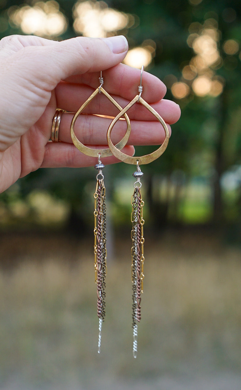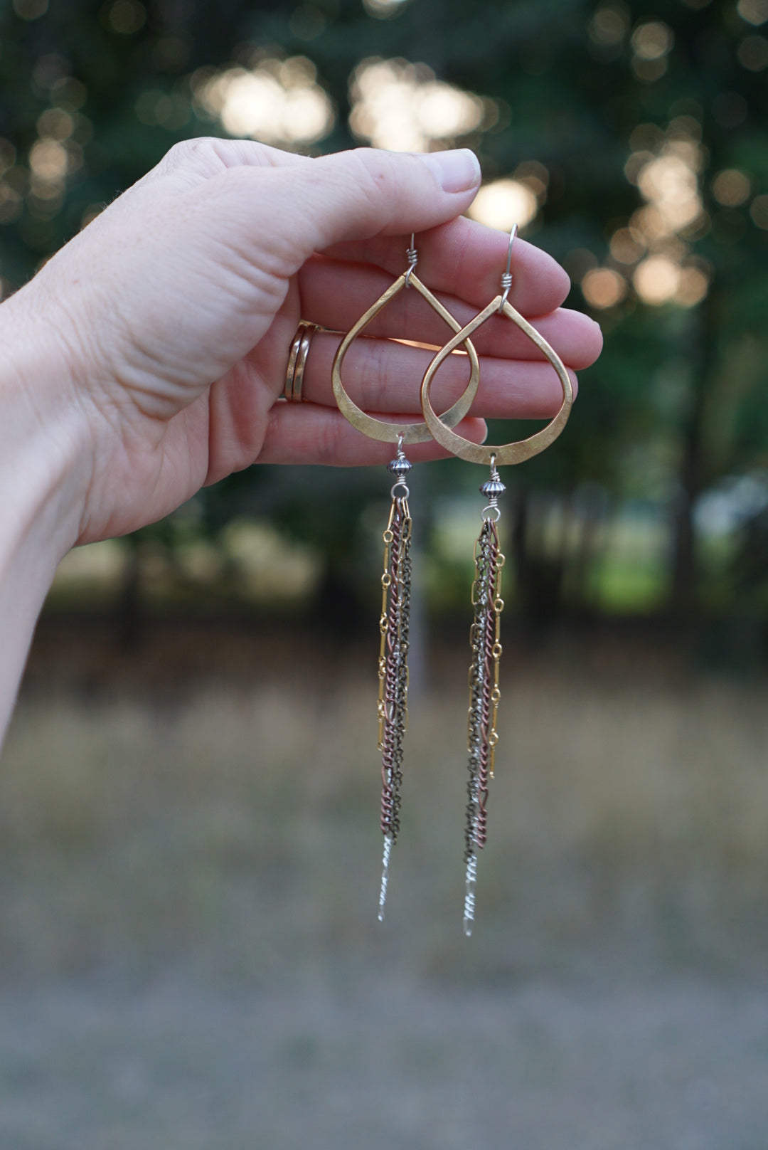 These earrings are so beautiful and fun; perfect for dancing! Teardrop shaped hoops with long and dangling chain mixed metal fringe in sterling silver, copper, antique brass and 14k Gold fill. These are sooo pretty on and will make you feel like a queen! They measure 6 inches long from the earwire to the bottom of the chain dangles. They are meant to "dust" the tops of your collarbone.