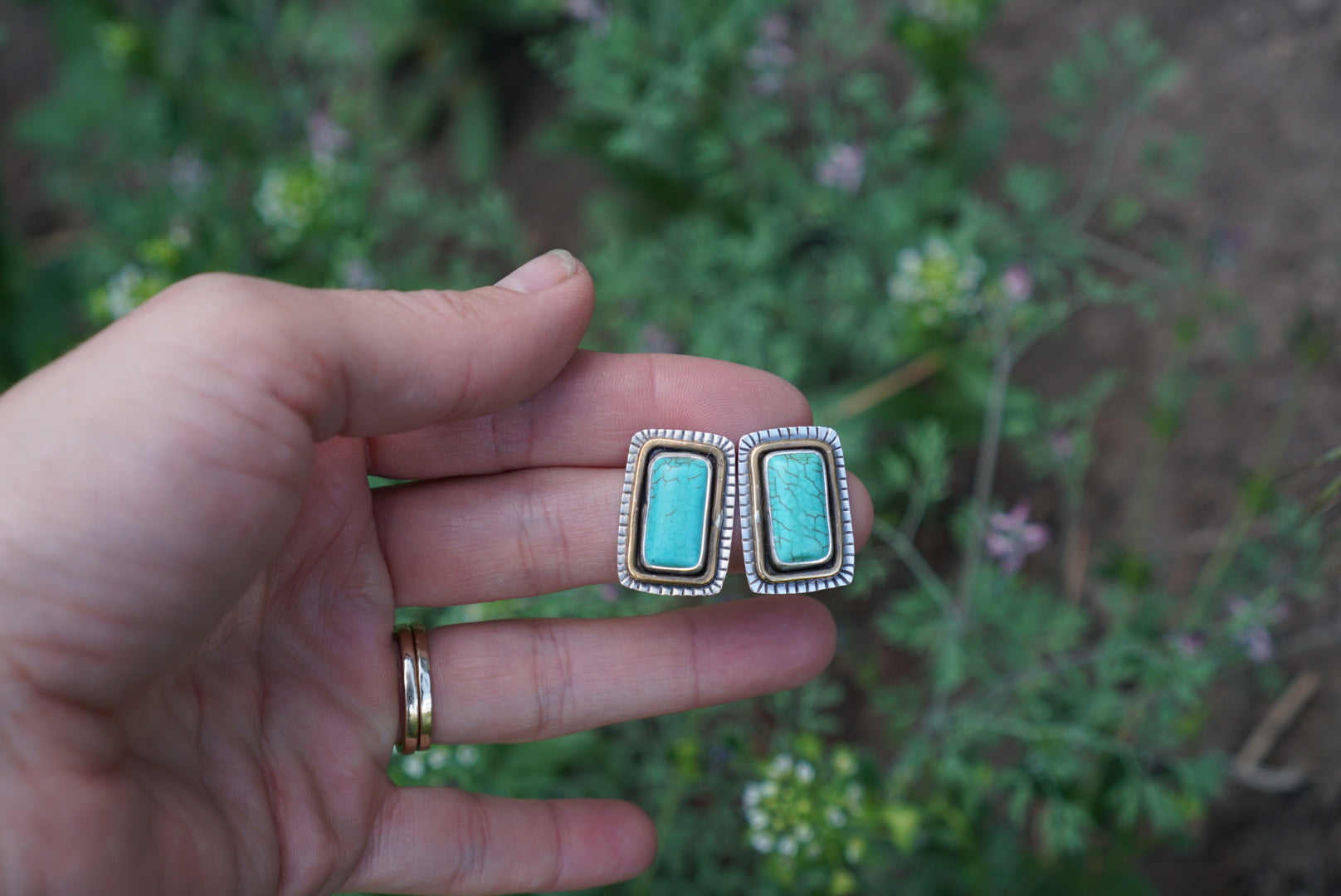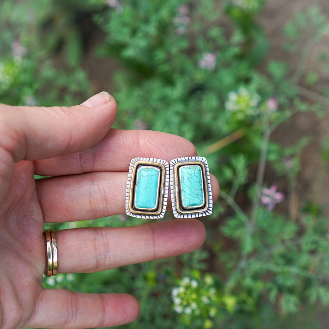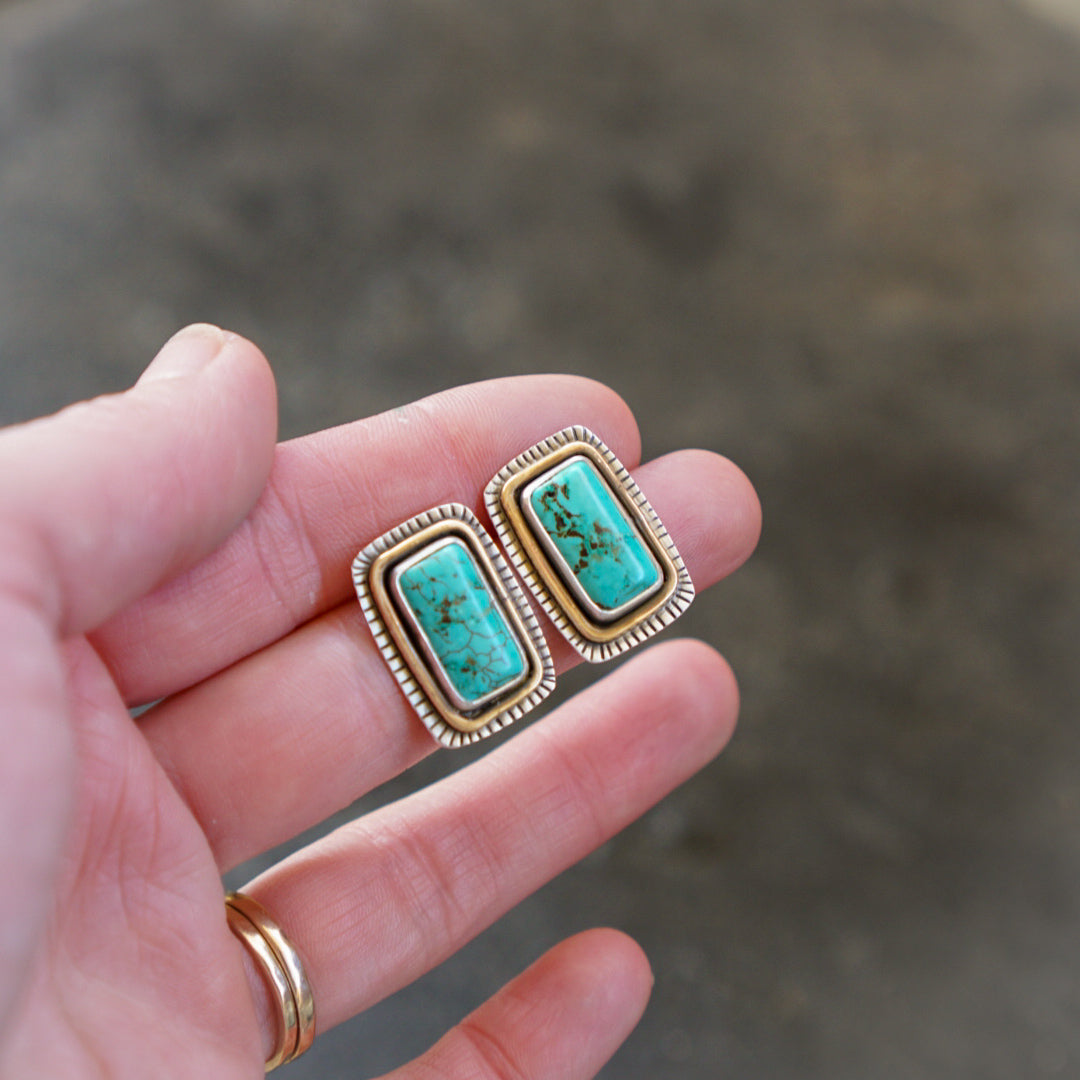 Gorgeous little mixed metal posts perfect and comfortable for the everyday. Made with fantastic rectangle pieces of Turquoise that are simply set in sterling silver and wrapped in brass detail the perched atop hand stamped backplates. Simple enough to wear with everything, but interesting enough to make a statement. Finished with sterling silver earnuts.