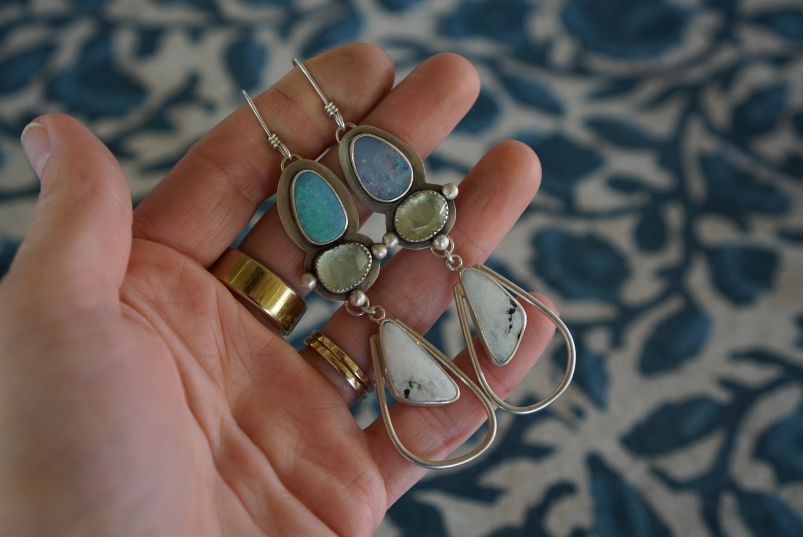 Amazing statement earrings made with gorgeous Australian Opals, icy seafood green Aquamarine, and milky whit White Buffalo Turquoise. These are one of a kind. Finished with silver ball and sterling silver loops, these are sure to catch people's eye. Earrings dangle about 3.5 inches in length and hang from hand crafted sterling silver earwires.