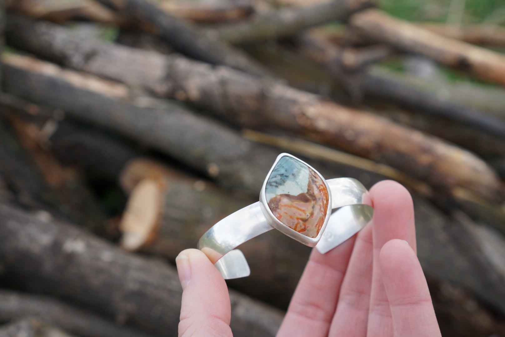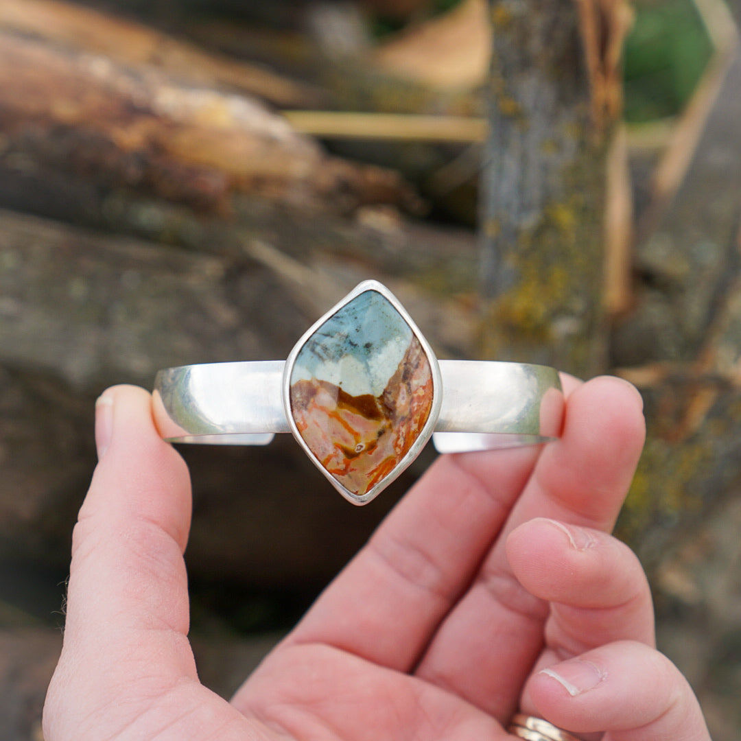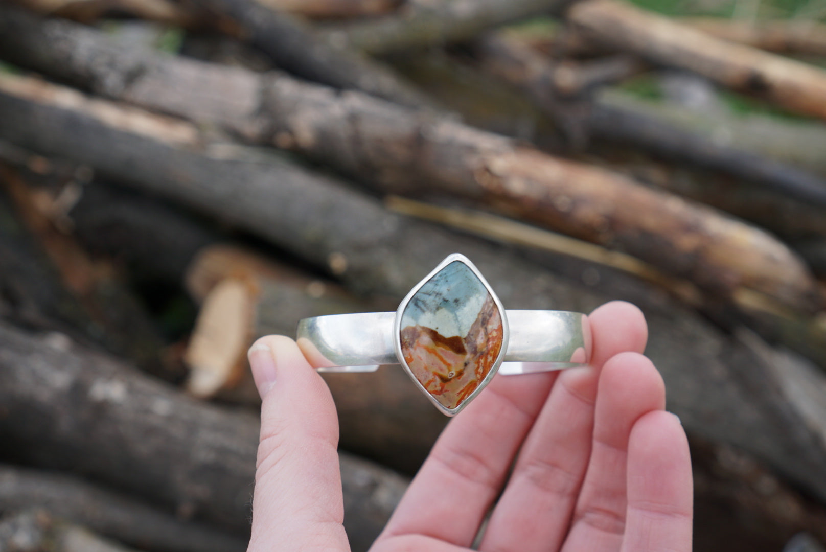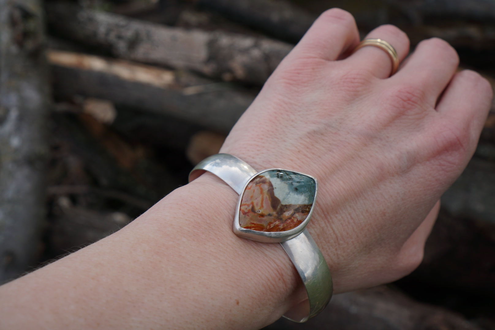 Stunning cuff constructed with an incredible big a chunky slice of Landscape Jasper. This bracelet features a wide low dome cuff and is sure to make a statement. Cuff measures 5.5 inches with a 1-1.5 inch opening and can be squeezed shut or pulled open for a good fit. This is a hefty cuff with a gorgeous stone and so beautiful!