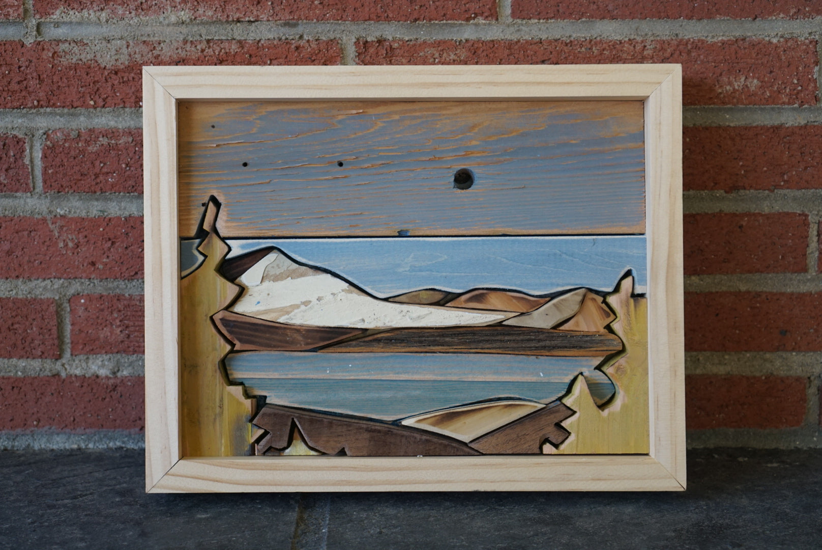 Sweet Lake Landscape Art from Plaid Beaver Co: Gorgeous handcrafted and painted woodworked mosaic landscape of Sweet Lake 2024. Dimensions 12"x10". Value: $230