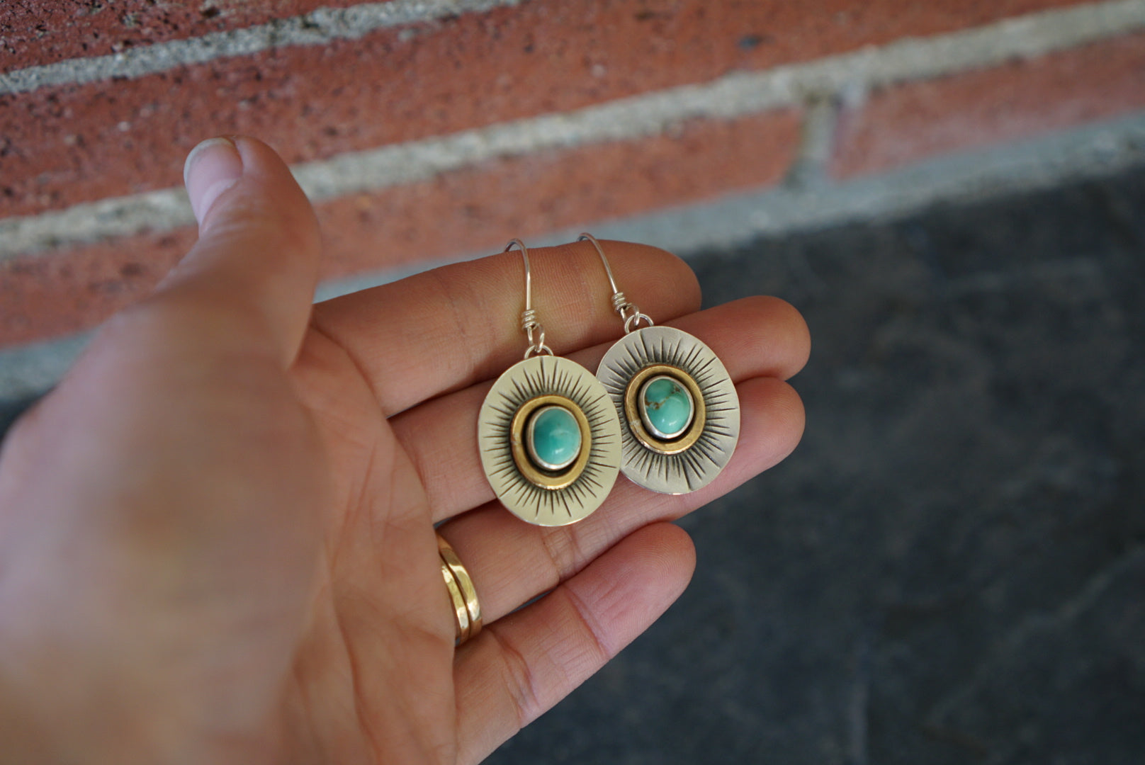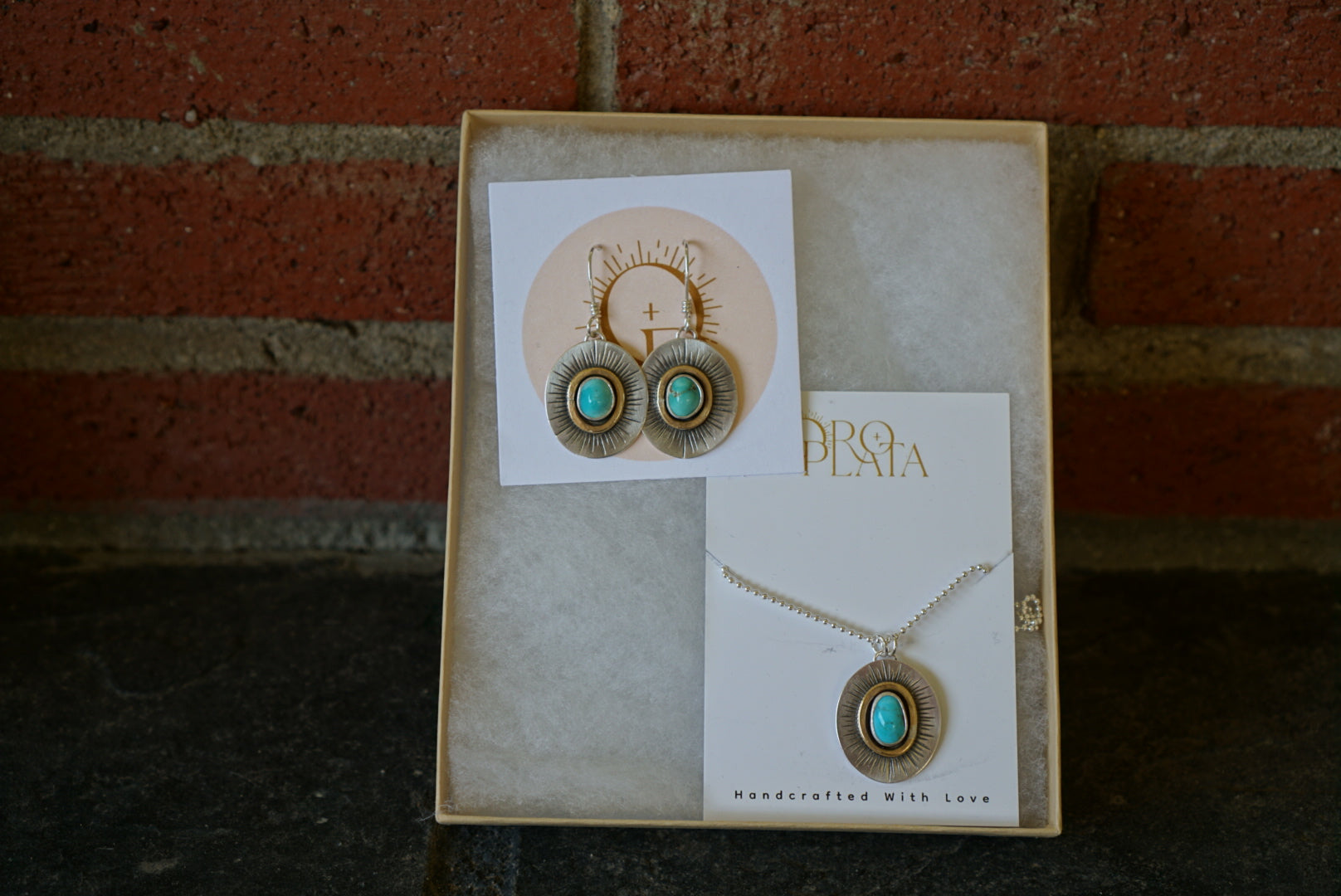Jewelry set from O&P Metalworks: One pair of Radiance Turquoise Earrings and a matching Radiance Turquoise Pendant necklace. Handcrafted from sterling silver, jewelers brass and genuine turquoise stone. Value: $260