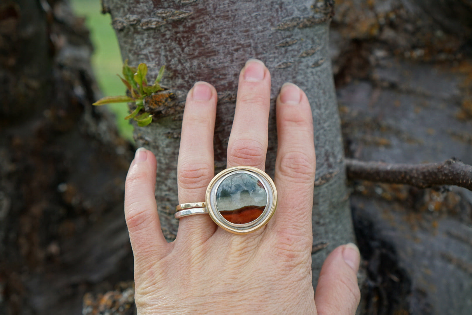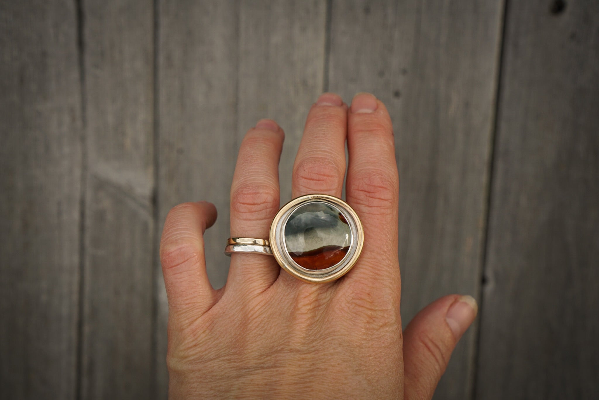 Hand crafted ring with a beautiful and stunning piece of high grade landscape Jasper whose matrix reminds me a high desert stormy sky. Beautiful design featuring a simple setting of recycled sterling silver with an organic shaped brass fringe around the the stone and crafted extra sturdy to hold up to whatever adventure you take it on. Ring band is a simple but beautiful wide dome. Ring measures a size 5-5.25